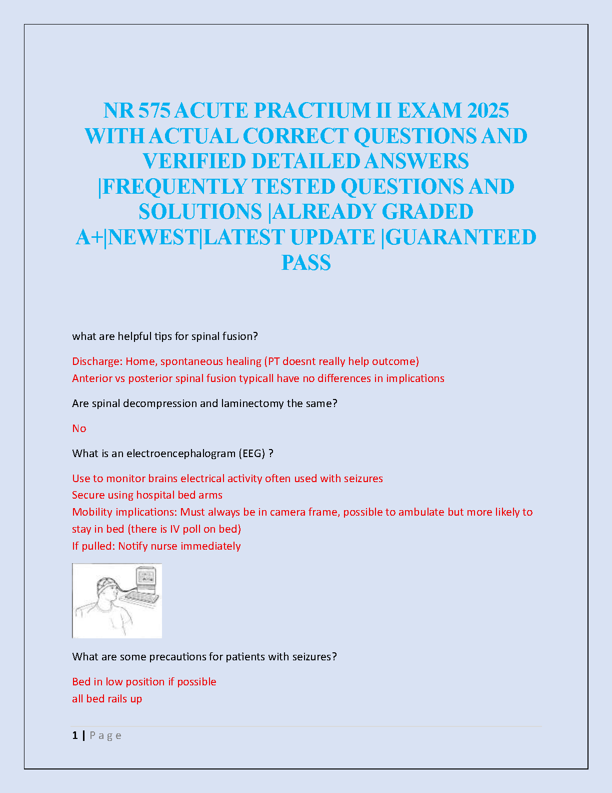 Ace your NR 575 Acute Practicum II exam with our comprehensive and up-to-date test bank for the 2025 academic year. This guide is expertly compiled with a full collection of frequently tested exam questions, each paired with a detailed, verified answer. Our resource is already A+ graded, ensuring you study the most accurate and relevant material. Covering key topics like spinal fusion, EEGs, and seizure precautions, this test bank is your ultimate tool to study effectively, grasp complex concepts, and pass your exam with confidence on the first try. Say goodbye to exam stress and resits!
