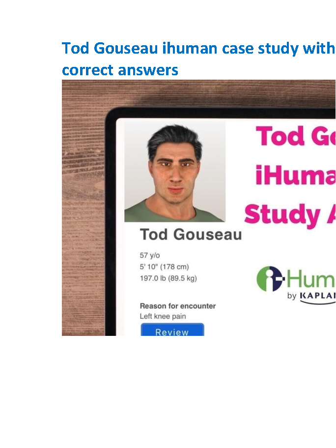 Struggling with the Tod Gouseau iHuman case study? Unlock immediate success with our comprehensive guide, featuring all the correct answers and detailed explanations. This resource is fully updated for the 2025/2026 academic year, specifically designed to help you master the material, boost your grades, and pass your exams on the very first attempt. Say goodbye to guesswork and resits—download now for guaranteed results!