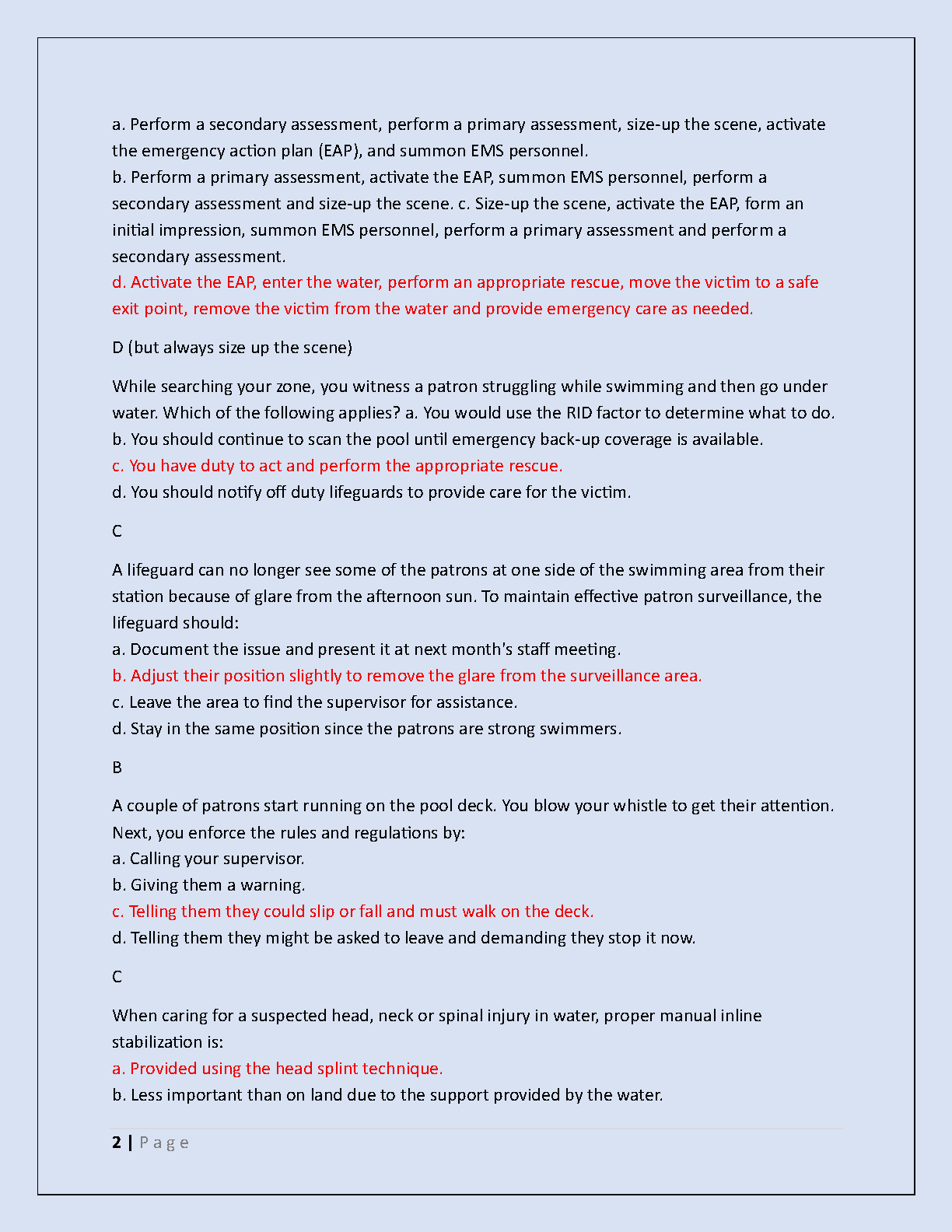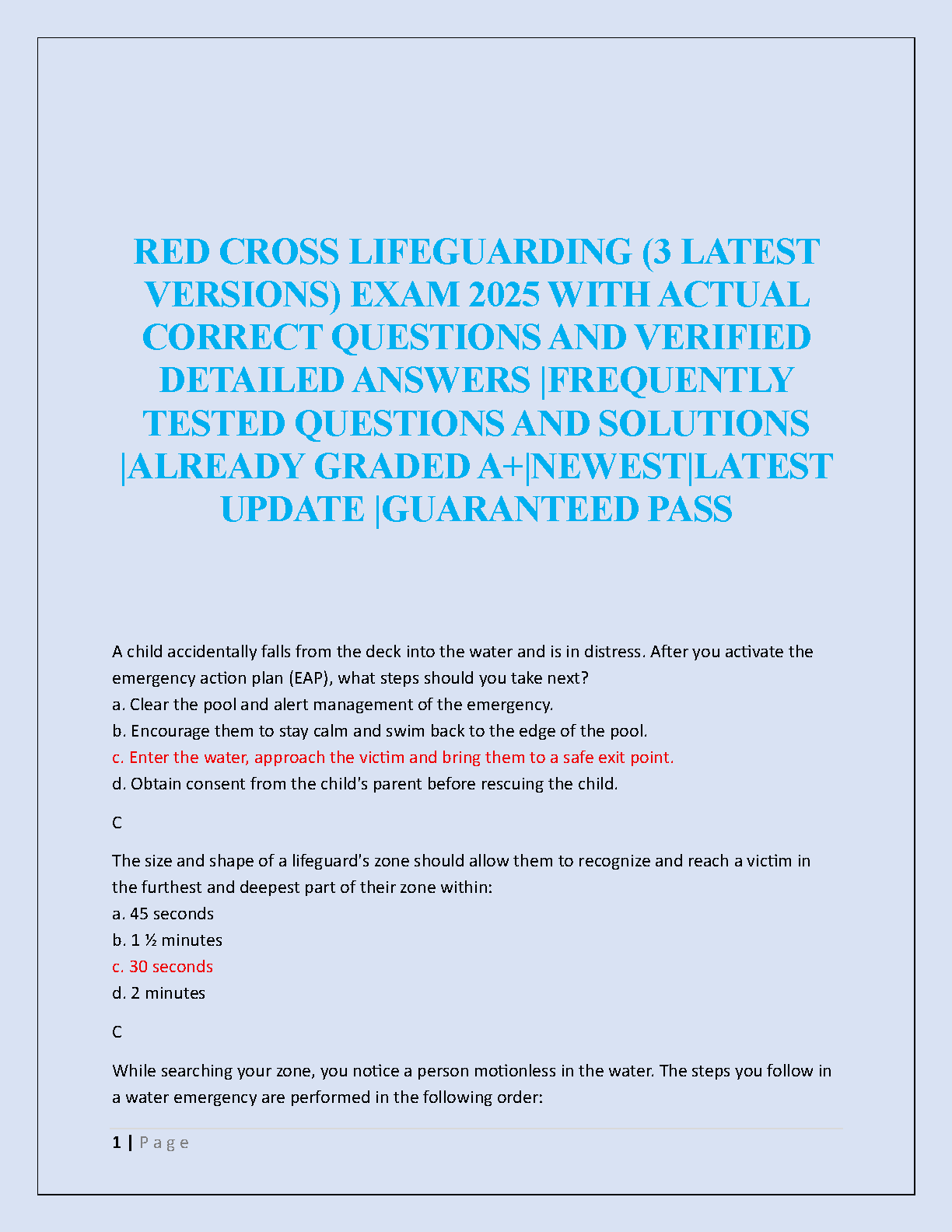 Prepare to ace your American Red Cross Lifeguarding certification with our comprehensive 2025 exam test bank! This essential study resource features three of the latest, complete exam versions, packed with actual questions and meticulously verified answers. Each question is designed to reflect the real test, covering crucial topics and frequently tested scenarios you'll encounter. Move beyond simple memorization with detailed solutions that explain the 'why' behind each answer, ensuring you have a deep understanding of lifeguarding principles. Our A+ graded material is your ultimate tool to build confidence, eliminate exam anxiety, and pass your lifeguarding test on the very first try. Secure your certification and start your lifeguarding career with the best preparation available!