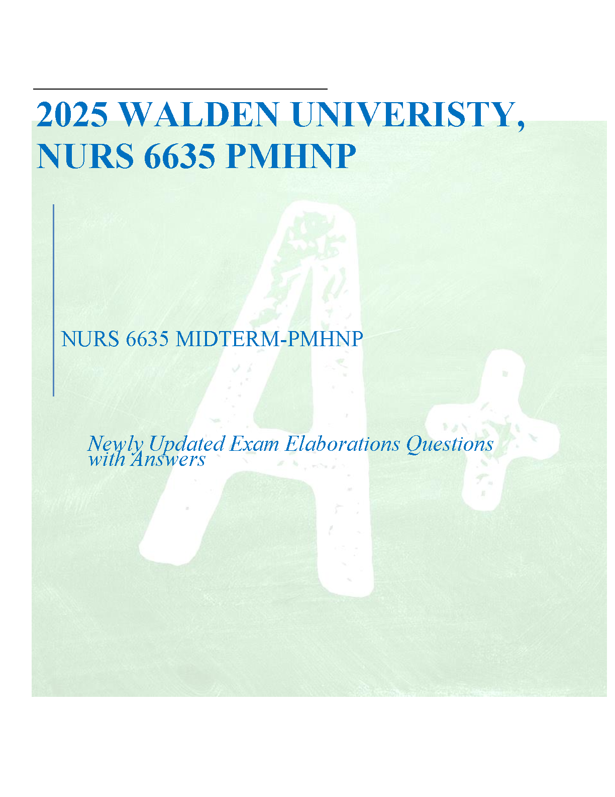 Struggling with the NURS 6635 PMHNP midterm at Walden University? Get ahead with our newly updated Exam Elaboration for the 2025/2026 academic year. This comprehensive guide provides in-depth questions and detailed, expertly crafted answers to cover all key topics. It's designed to give you a thorough understanding of the material, boost your confidence, and help you secure an A+ grade. Ace your midterm on the very first attempt and avoid the stress of resits with this essential study resource.