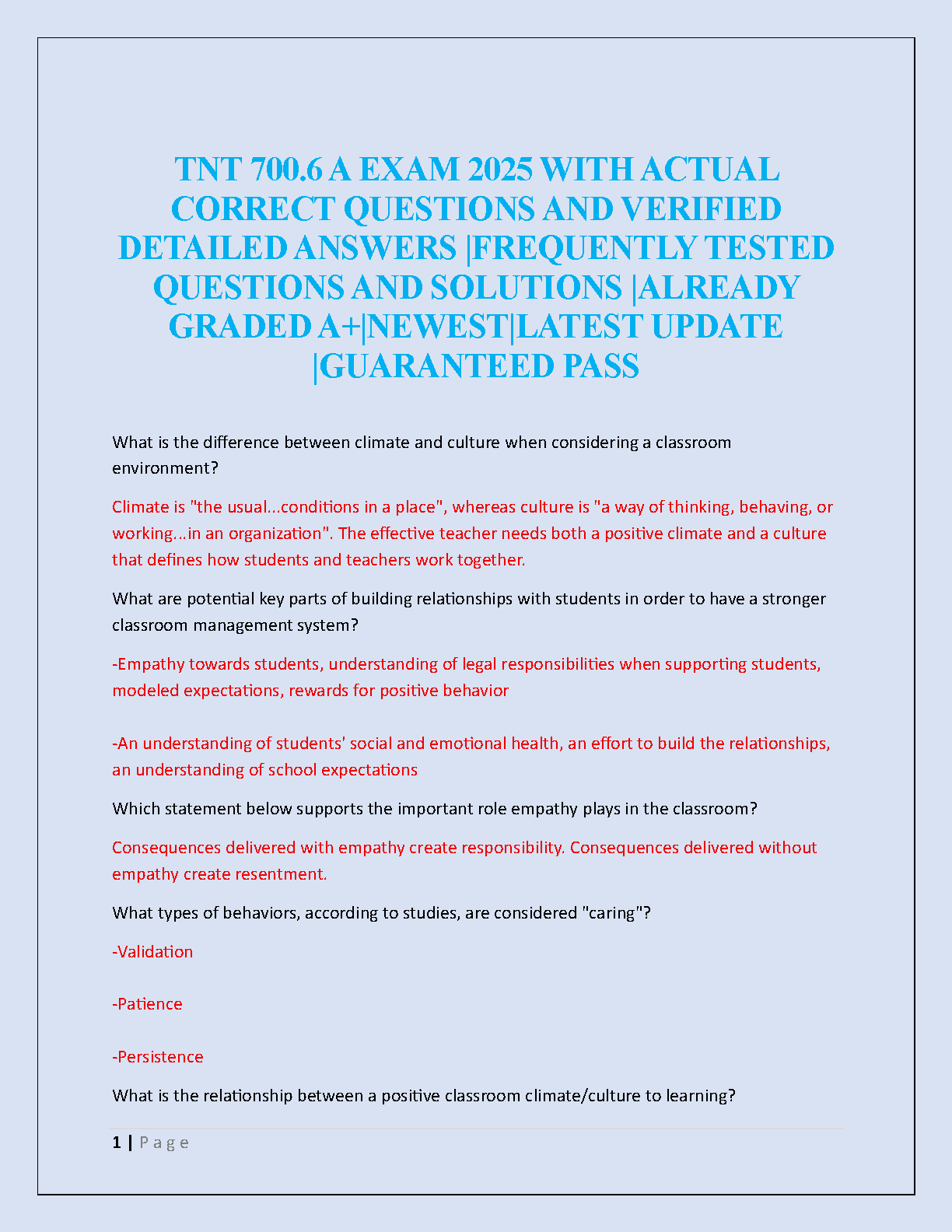 Ace your TNT 700.6 A exam with our comprehensive 2025 test bank! This is your ultimate study resource, featuring a complete collection of the latest, frequently tested exam questions paired with verified, detailed answers and solutions. Our guide is meticulously prepared to ensure you grasp key concepts such as the distinction between classroom climate and culture, strategies for building strong student relationships, and the vital role of empathy in education. Every question is A+ graded, providing you with the confidence and knowledge needed to pass on your first try. Don't leave your success to chance—get the latest update and guarantee your pass!