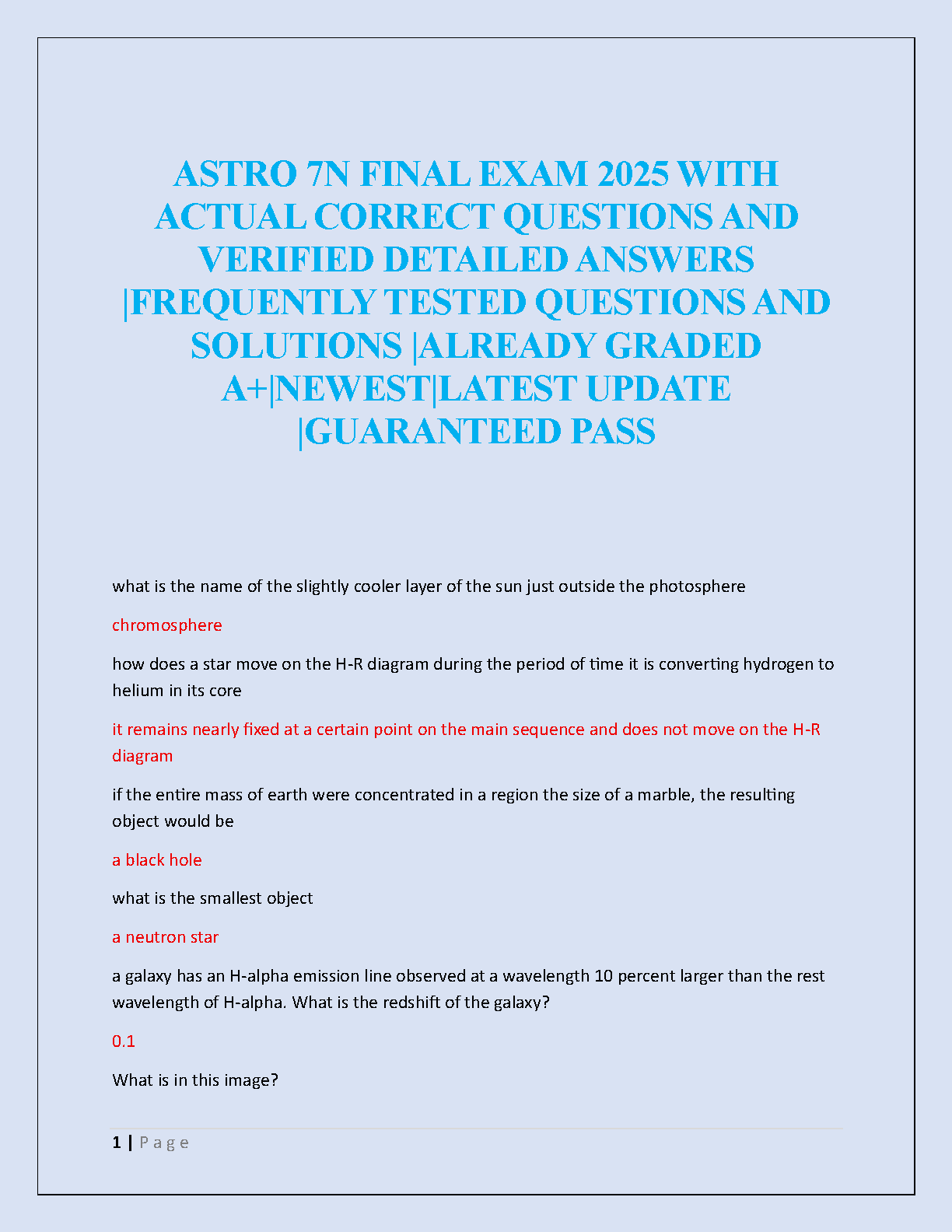 Ace your ASTRO 7N Final Exam with our 2025 updated test bank. This comprehensive study guide provides a complete set of actual exam questions, each with verified and detailed answers. Covering all key topics, from the sun's layers to galaxy redshifts, this resource is already graded A+ and designed to guarantee your success. Prepare effectively, understand complex concepts easily, and pass your exam on the first attempt without the stress of resits.