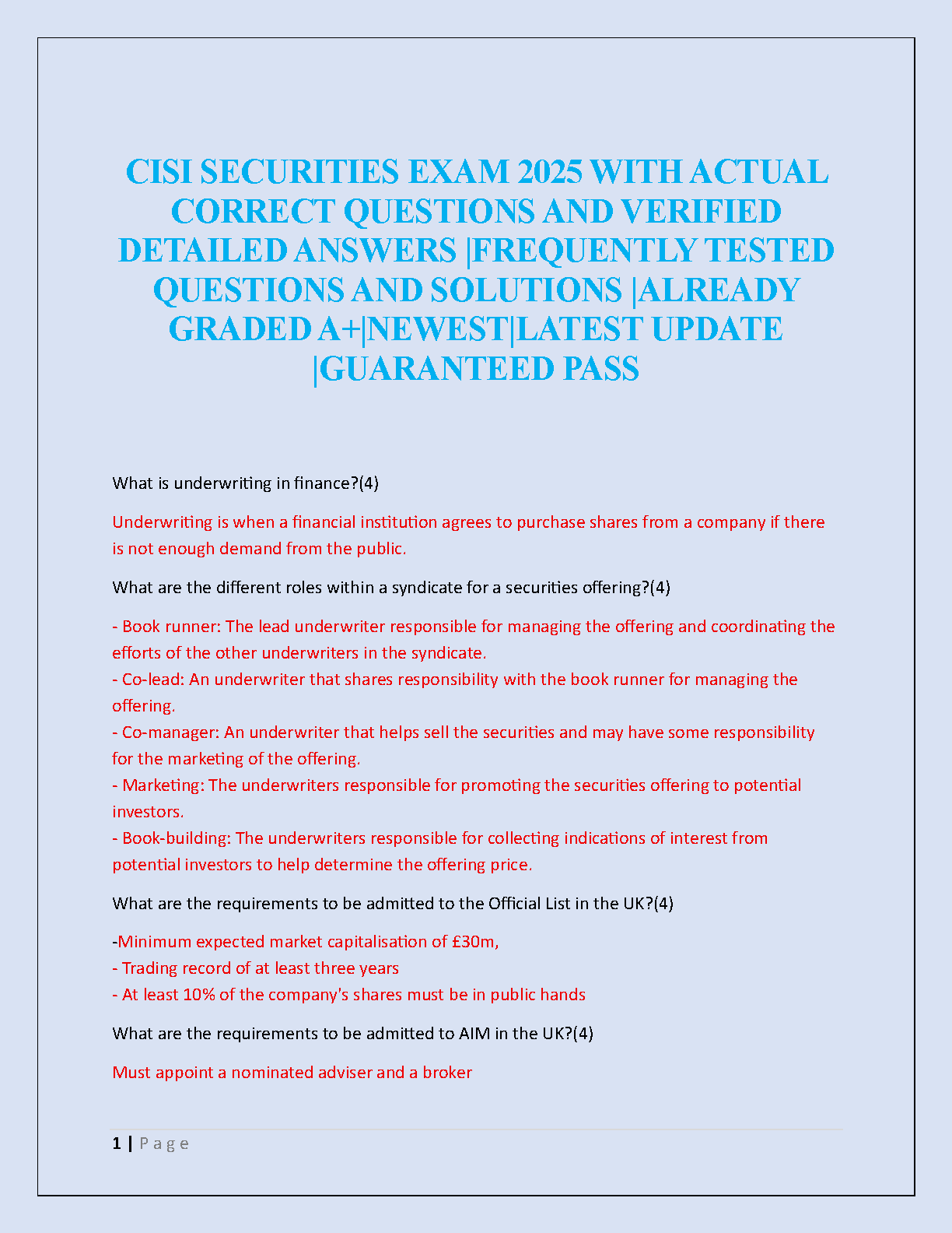 Prepare to excel in your CISI Level 3 Certificate in Securities exam with our premier 2025 Test Bank. This guide features a comprehensive collection of actual exam questions complemented by detailed, A+ graded answers and solutions. Master crucial topics like financial underwriting, syndicate roles, and UK market listing requirements. This up-to-date resource is your key to understanding the material thoroughly, building confidence, and achieving a guaranteed pass on your first try. Get the ultimate study companion for your CISI qualification.
