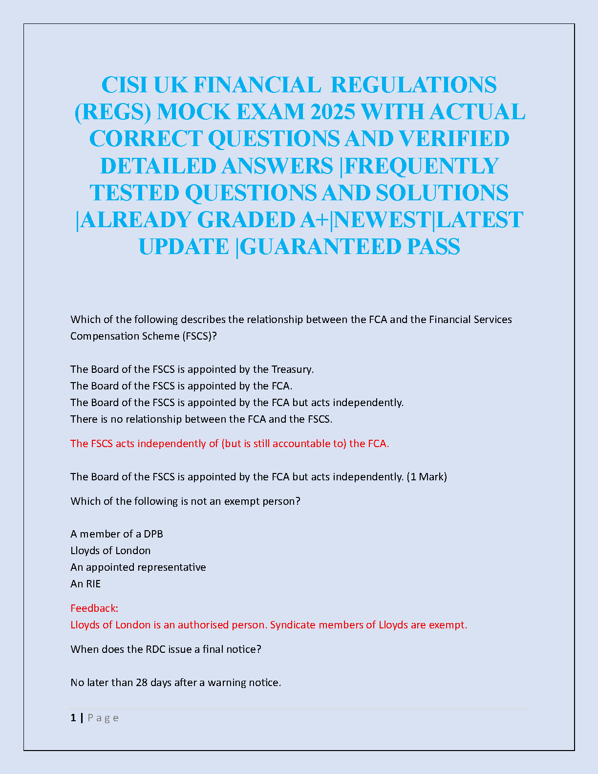 CISI UK Financial Regulations (REGS) 2025/2026 Mock Exam: Latest A+ Graded Questions and Verified Answers for a First-Time Pass