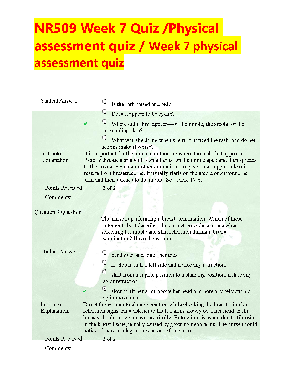 Unlock a perfect score on your NR 509 Week 7 Physical Assessment Quiz with this comprehensive test bank. This resource features all 25 multiple-choice questions, complete with verified correct answers and detailed instructor explanations for each. Aligned with the 'Advanced Health Assessment and Diagnostic Reasoning, 4th Edition' by Dains, Baumann, & Scheibel, this guide is your key to mastering complex concepts. Prepare effectively for the 2025/2026 academic year, understand the rationale behind each answer, and pass your exams on the first attempt, avoiding costly resits.