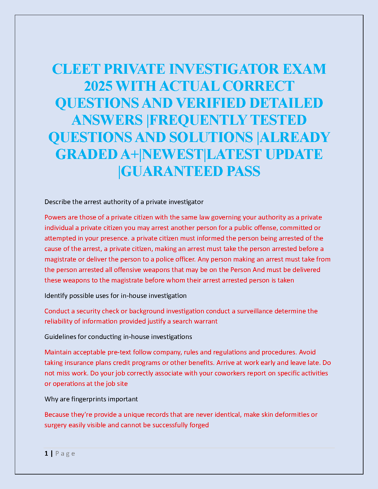 Ace your CLEET Private Investigator Exam on the first try with our comprehensive 2025 Test Bank. This premium study guide is packed with actual exam questions and verified, detailed answers to ensure you're fully prepared. Covering all frequently tested topics, including arrest authority, in-house investigations, and evidence handling, this resource is already A+ graded and updated for the latest exam version. Stop worrying about resits and secure your license with confidence. Get the ultimate preparation tool for a guaranteed pass!