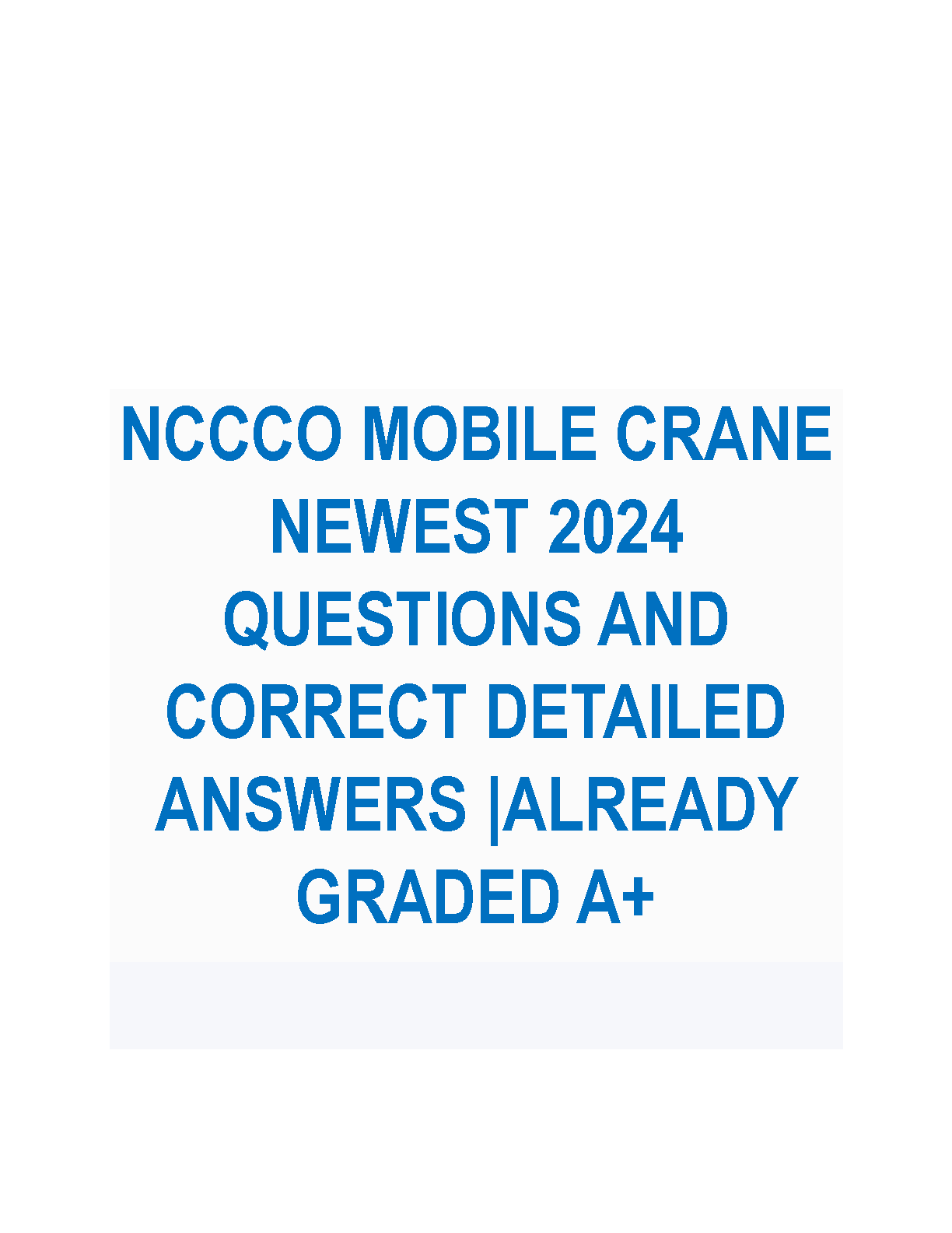 Prepare to ace your NCCCO Mobile Crane Operator certification with our top-rated 2024 test bank. This essential study guide features a comprehensive collection of the newest exam questions, each accompanied by correct, detailed answers. Our resource is already 'Graded A+', giving you the confidence that you are studying the most relevant and accurate material. Stop worrying about resits and start your path to certification success. Download now to master the core concepts and pass your NCCCO exam on the very first attempt!