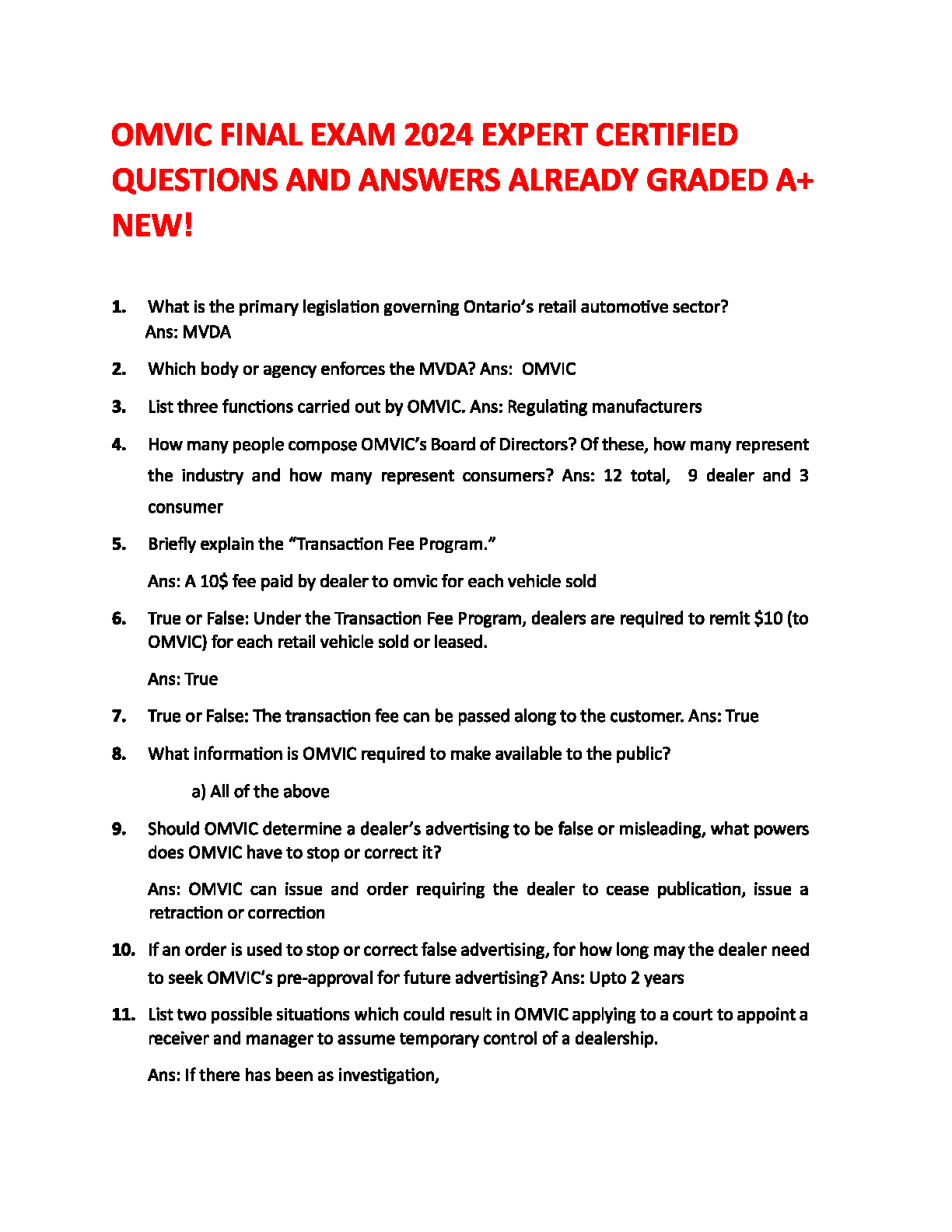 Ace your OMVIC Certification Exam on the first try with our comprehensive 2024 Test Bank. This premium study guide features a complete set of expert-verified questions and detailed answers, already graded A+, to ensure you master the material. Covering all essential topics from the Motor Vehicle Dealers Act (MVDA) to OMVIC regulations and procedures, this resource is designed to give you the confidence and knowledge needed to pass with flying colors. Start your successful career in Ontario's automotive retail sector today!