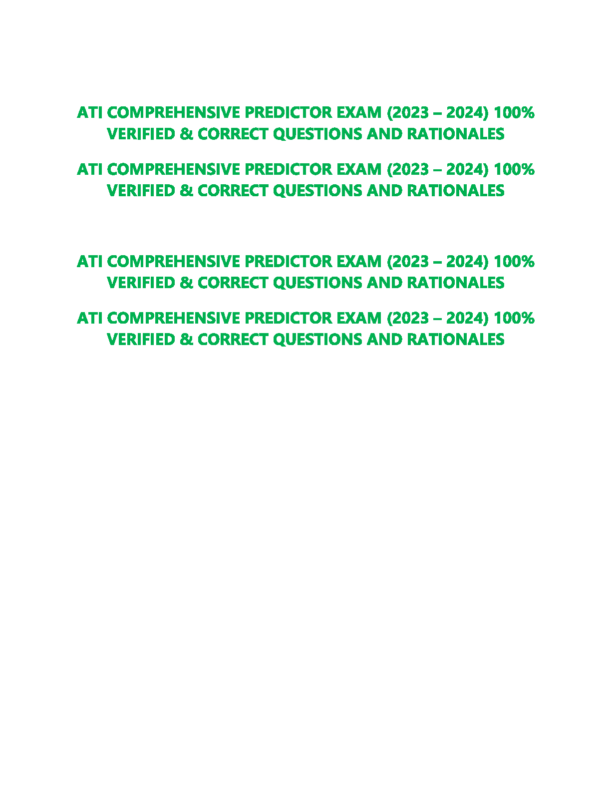 Unlock your potential and ace the ATI Comprehensive Predictor exam with our meticulously compiled 2023-2024 test bank. This essential study guide provides a complete set of 100% verified and correct questions, each accompanied by a detailed rationale. By understanding not just the 'what' but the 'why' behind each answer, you'll build the critical thinking skills necessary for success. This resource is expertly designed to help nursing students pass the predictor on their first attempt, solidify their knowledge, and confidently step into their NCLEX preparation. Don't leave your success to chance—get the ultimate preparation tool today!