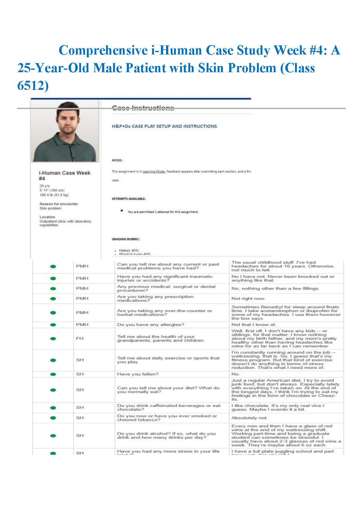 Unlock success in your nursing or medical program with our comprehensive guide for the i-Human Case Study for Week 4, featuring a 25-year-old male patient presenting with a skin problem. This latest 2025/2026 resource provides a complete walkthrough of the virtual patient encounter, including the essential questions for patient history (PMH, FH, SH) and key findings. Designed to help you master the case, achieve a top grade, and confidently pass your assessment on the first attempt. Avoid the stress of resits with this essential study aid.
