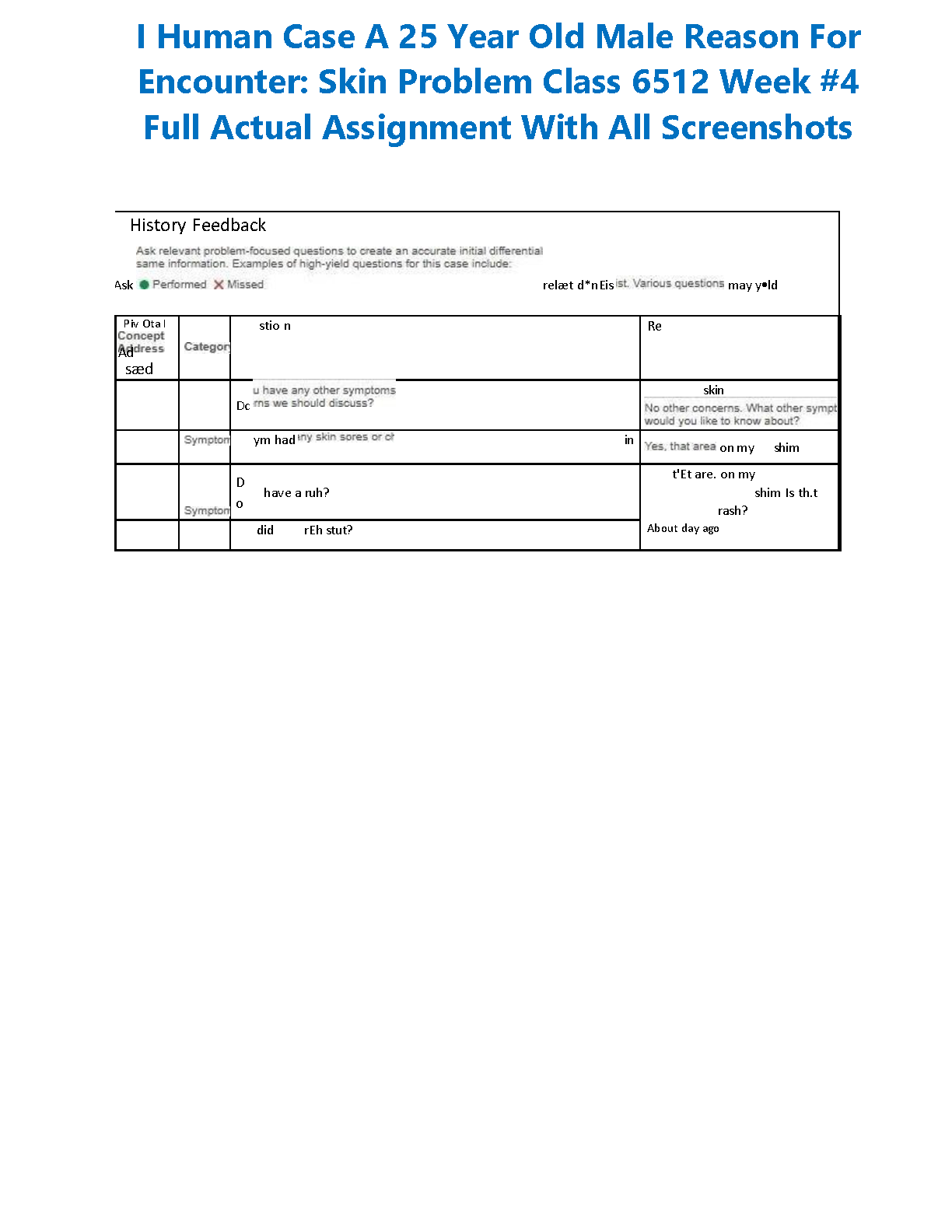 Get the complete, step-by-step solution for the iHuman case study from Class 6512, Week 4. This resource covers the entire patient encounter with a 25-year-old male presenting with a skin problem. It includes all necessary screenshots and detailed information to help you navigate the assignment successfully. Updated for the 2025/2026 academic year, this guide is designed to ensure you understand the case thoroughly, achieve a top grade, and pass your assessments without needing to resit. Master your clinical reasoning skills with this comprehensive walkthrough.