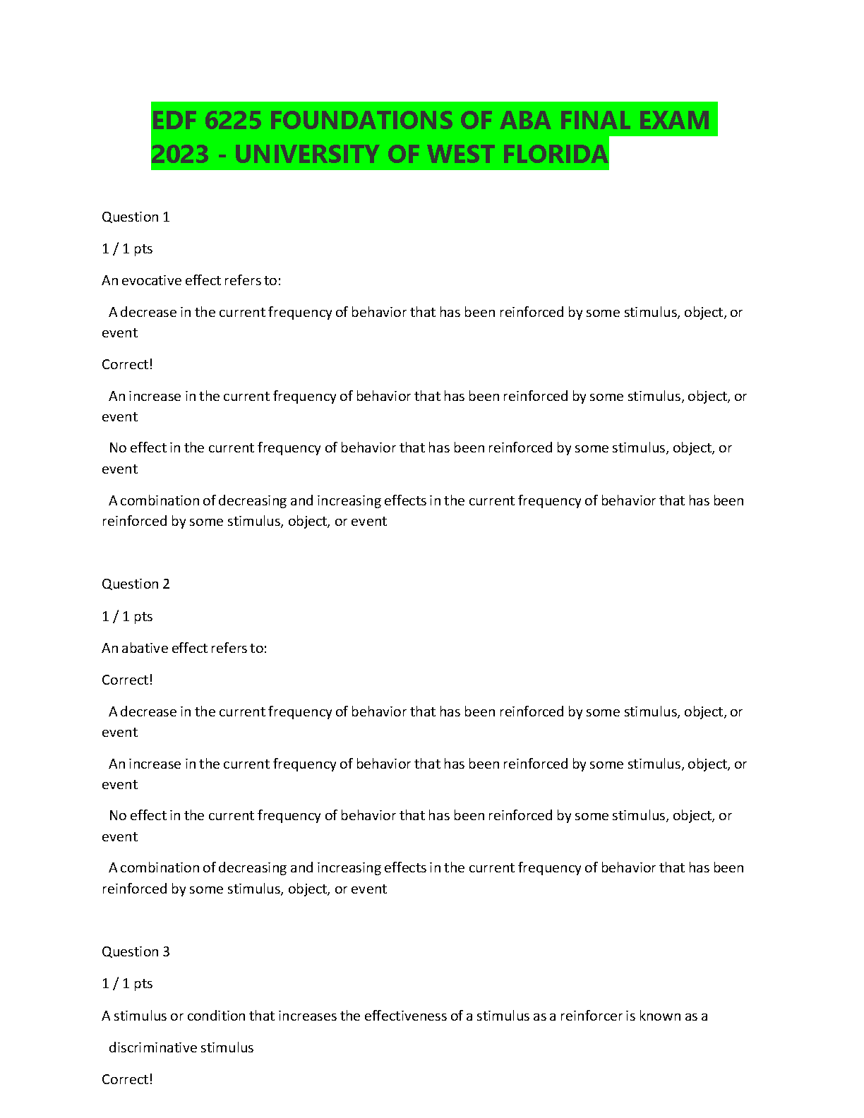 Master your EDF 6225 course with this comprehensive final exam elaboration for Foundations of ABA at the University of West Florida. This essential study guide contains a complete set of verified questions and answers from the actual 2023 exam, meticulously curated for the 2025/2026 academic year. Gain a deep understanding of core ABA principles and walk into your exam with the confidence to succeed. This resource is your key to acing the final and passing on your first attempt, eliminating the need for costly and stressful resits.