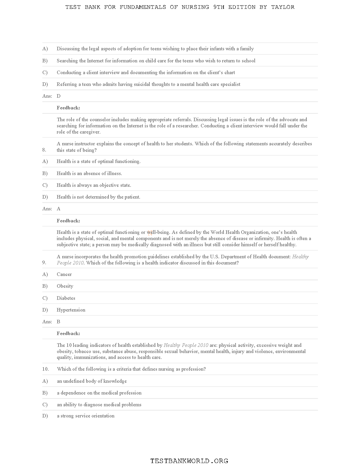 Test Bank for Fundamentals of Nursing, 9th Edition by Carol R. Taylor, Pamela B. Lynn, and Jennifer L. Bartlett