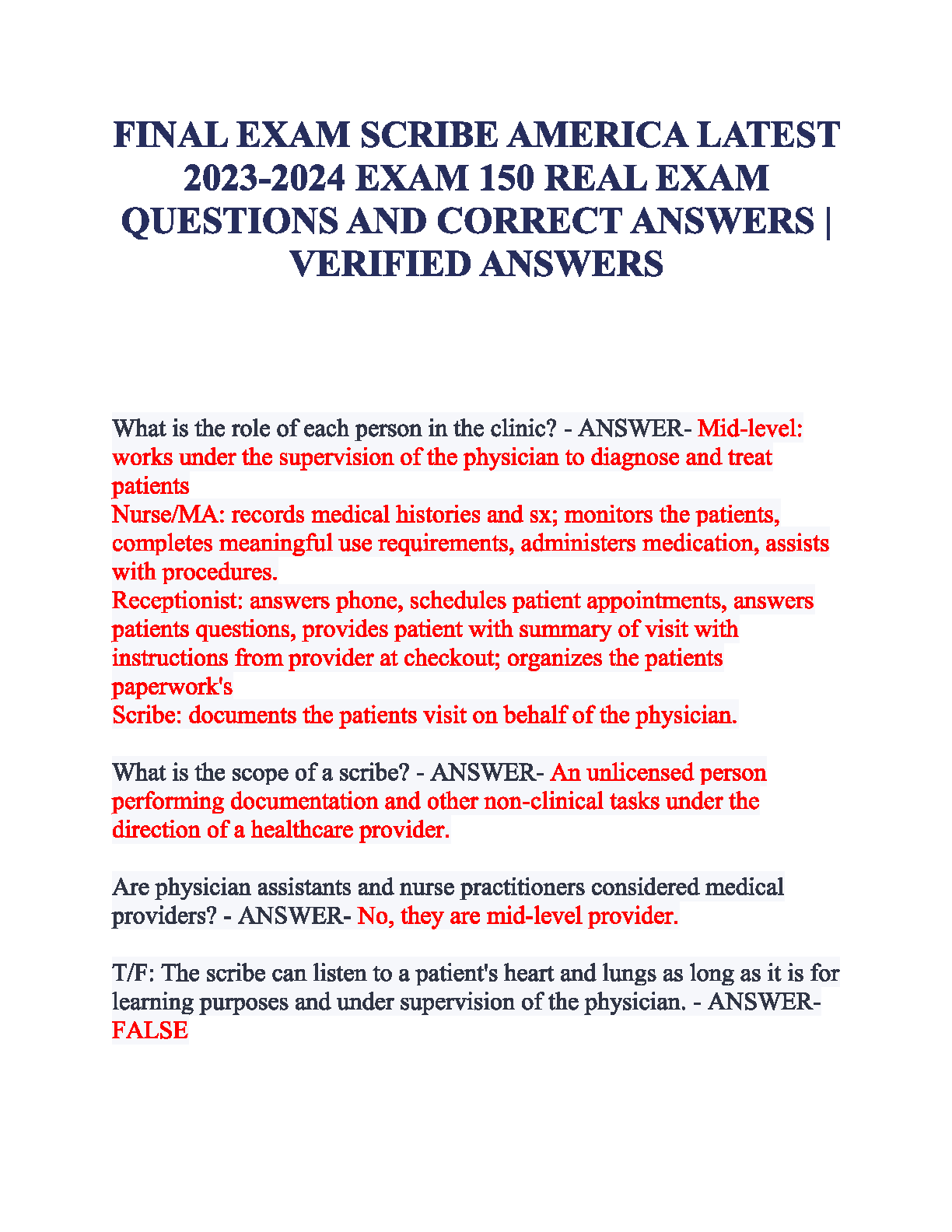 Get ready to pass your Scribe America Final Exam on the first try with our latest 2025-2026 test bank. This comprehensive resource features 150 real exam questions, each paired with a verified, correct answer. Master key concepts such as the specific roles of clinic personnel (Mid-level providers, Nurses/MAs, Receptionists, and Scribes), understand the precise scope of a scribe's duties, and clarify common misconceptions about medical providers. Our study guide is meticulously prepared to ensure you have the knowledge and confidence to excel. Avoid the stress of resits and start your career as a medical scribe successfully. Download now for instant access to the ultimate study tool!