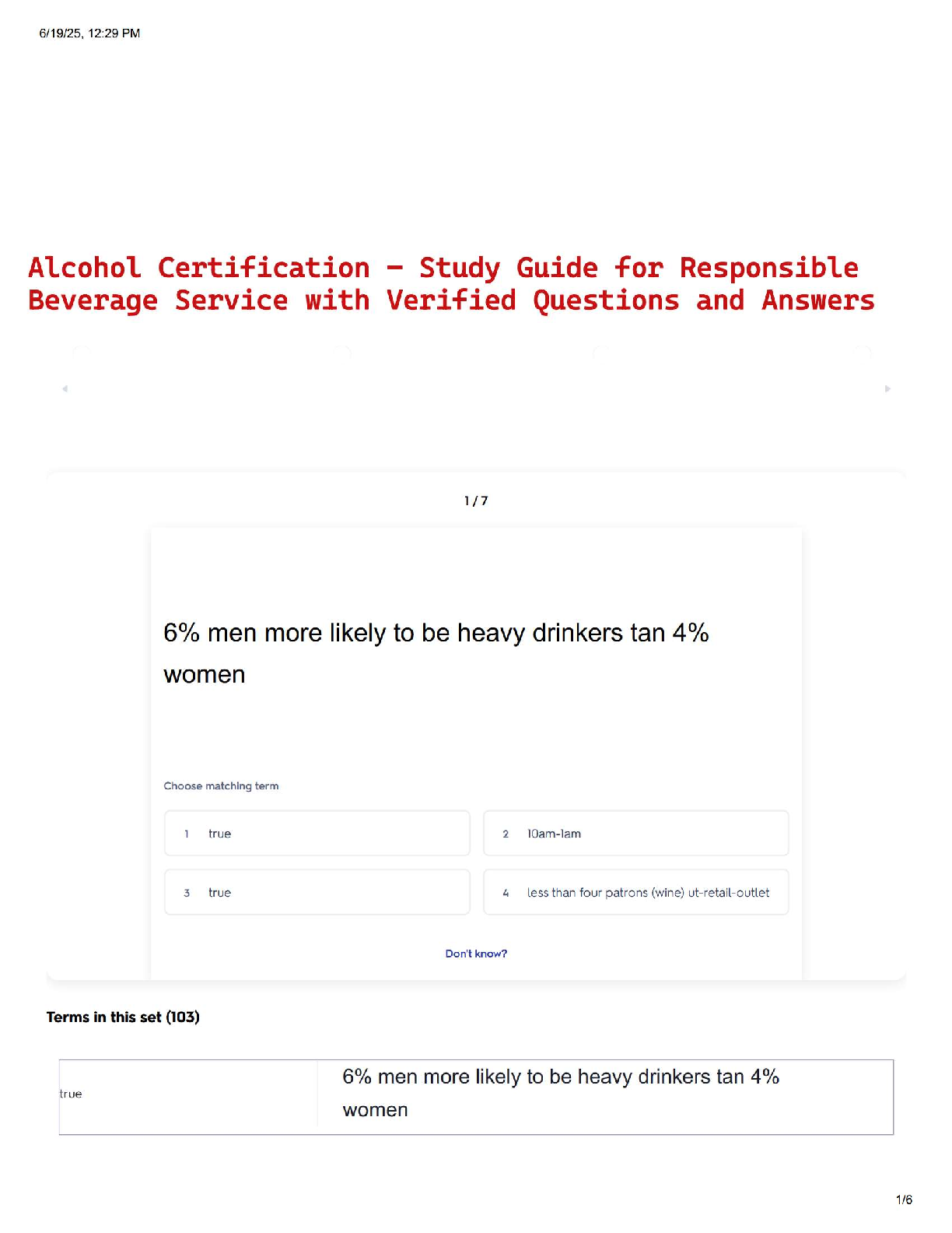 Get ready to ace your Alcohol Certification exam for Responsible Beverage Service with our latest 2025/2026 study guide! This comprehensive resource is expertly crafted to help you pass on your very first attempt, eliminating the stress of resits. Inside, you'll find a complete set of 103 verified questions and detailed answers, covering all the essential topics you need to know. Whether you're aiming for your Smart Serve certification or another state's responsible beverage service permit, this guide is your key to success. Download now and get certified with confidence!