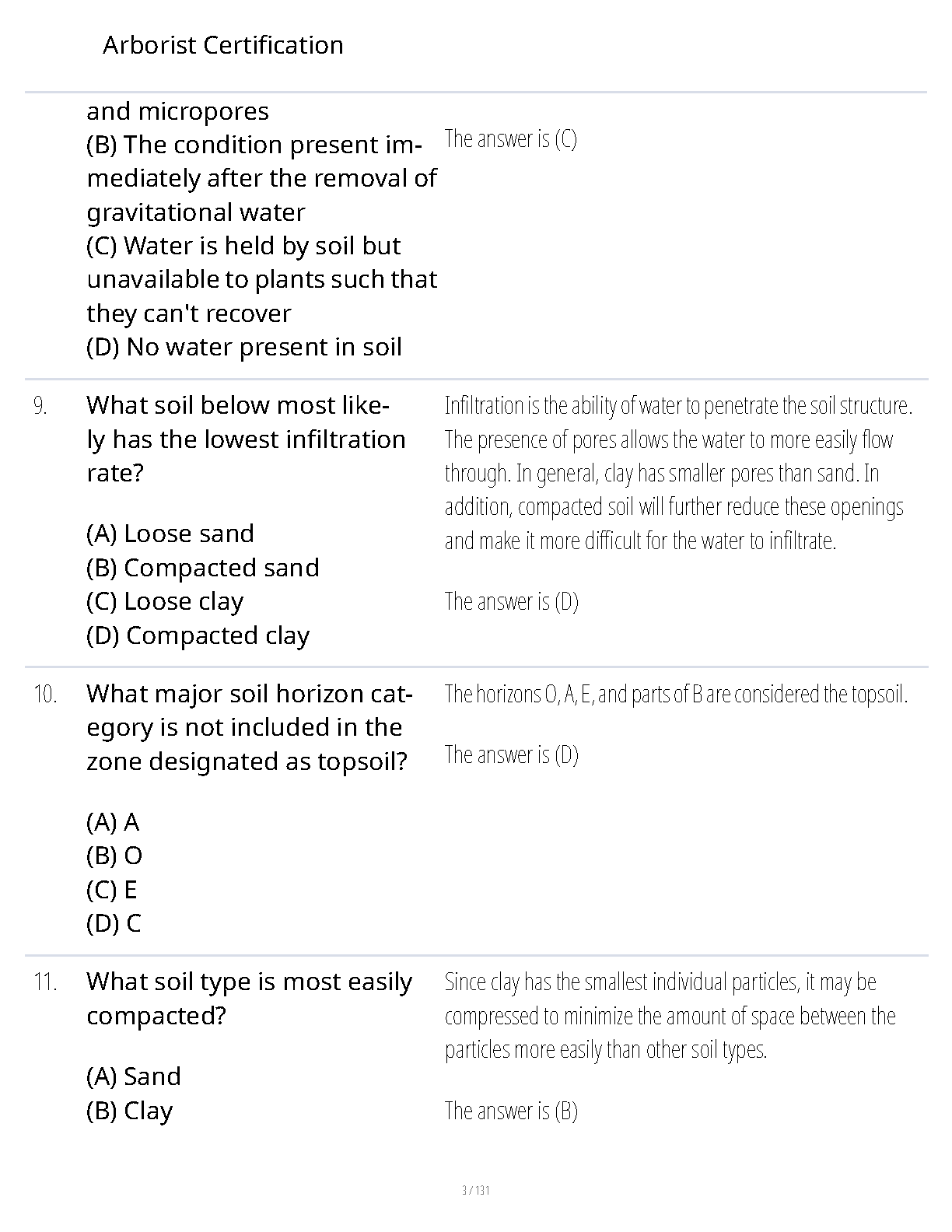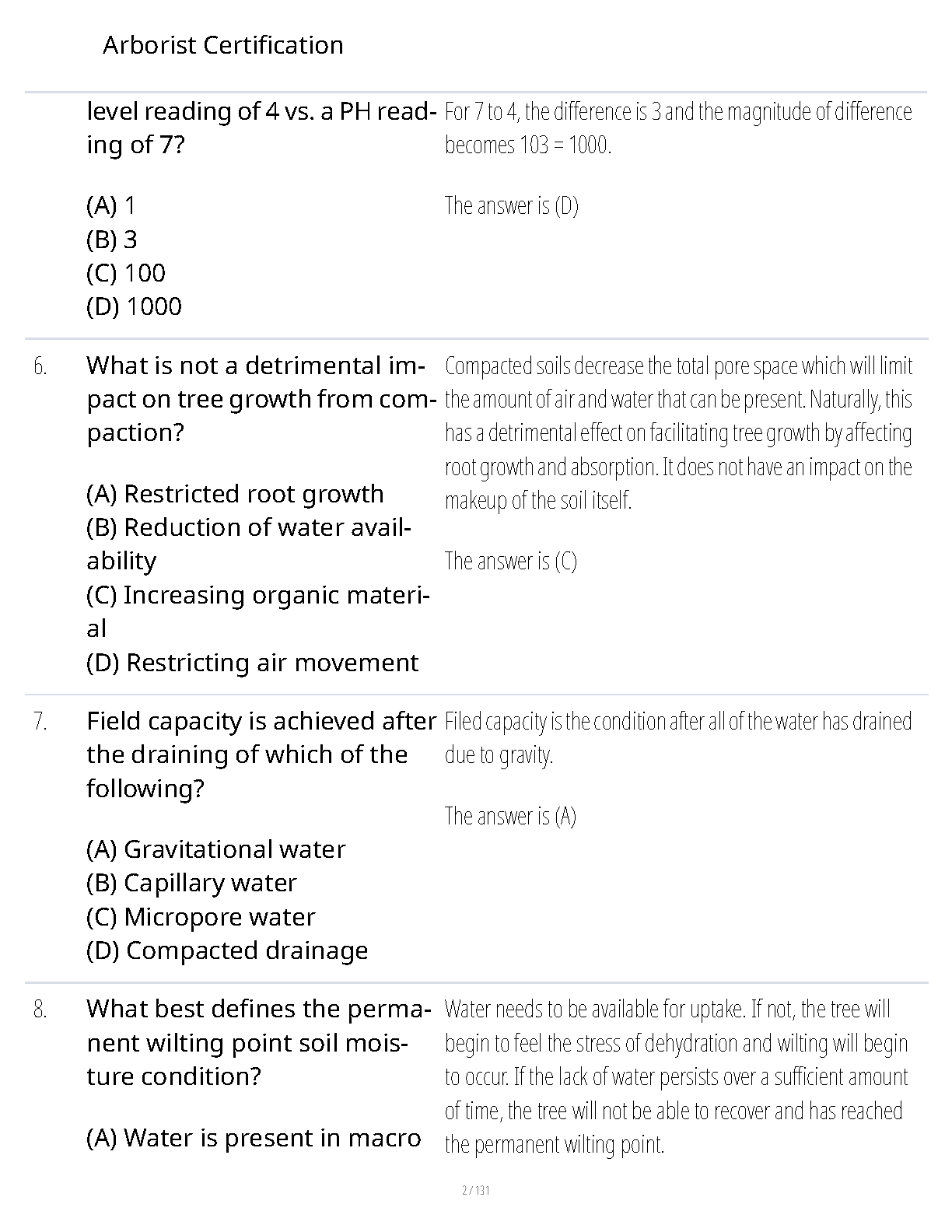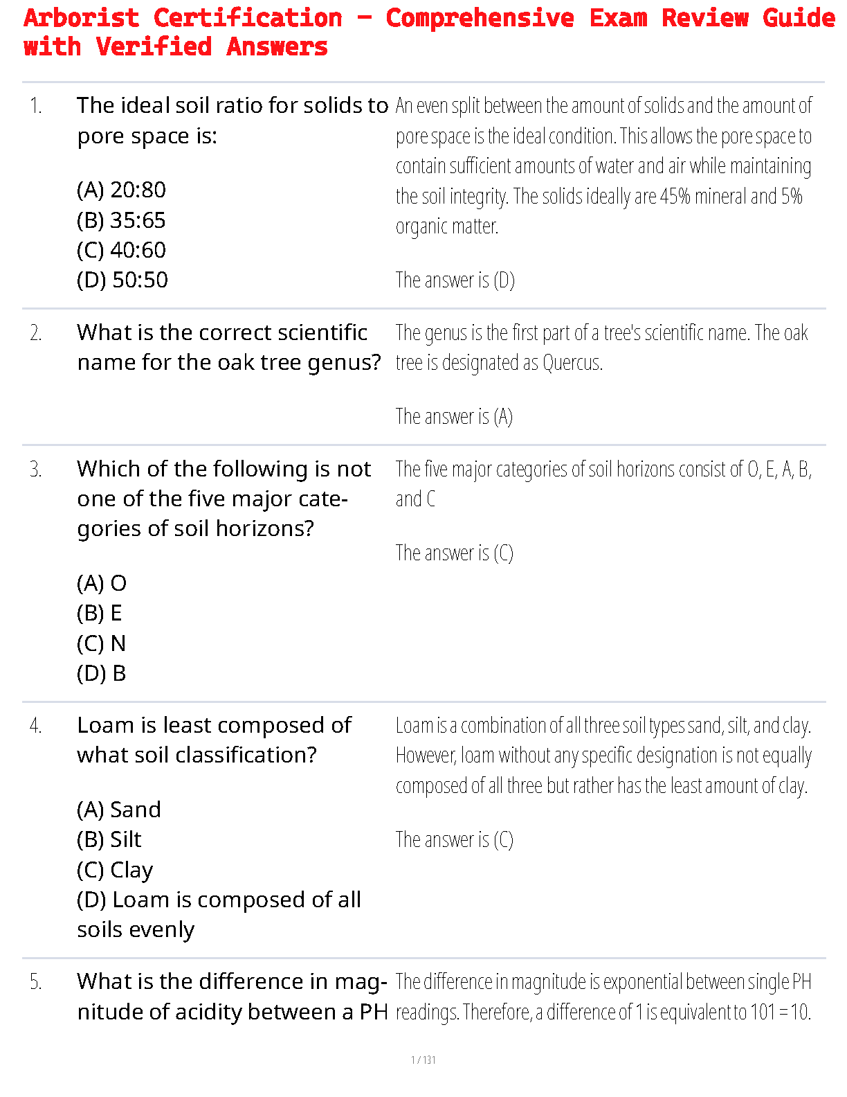 Prepare to ace your Arborist Certification Exam with our comprehensive test bank, packed with verified questions and detailed answers. This 131-page study guide is meticulously designed to cover all crucial topics you'll face on the test, including soil science, tree identification, pruning techniques, and safety protocols. Each question comes with a clear explanation, ensuring you not only know the right answer but also understand the core concepts behind it. Boost your confidence and knowledge, and get ready to pass your certification exam on the first try with this essential review tool.