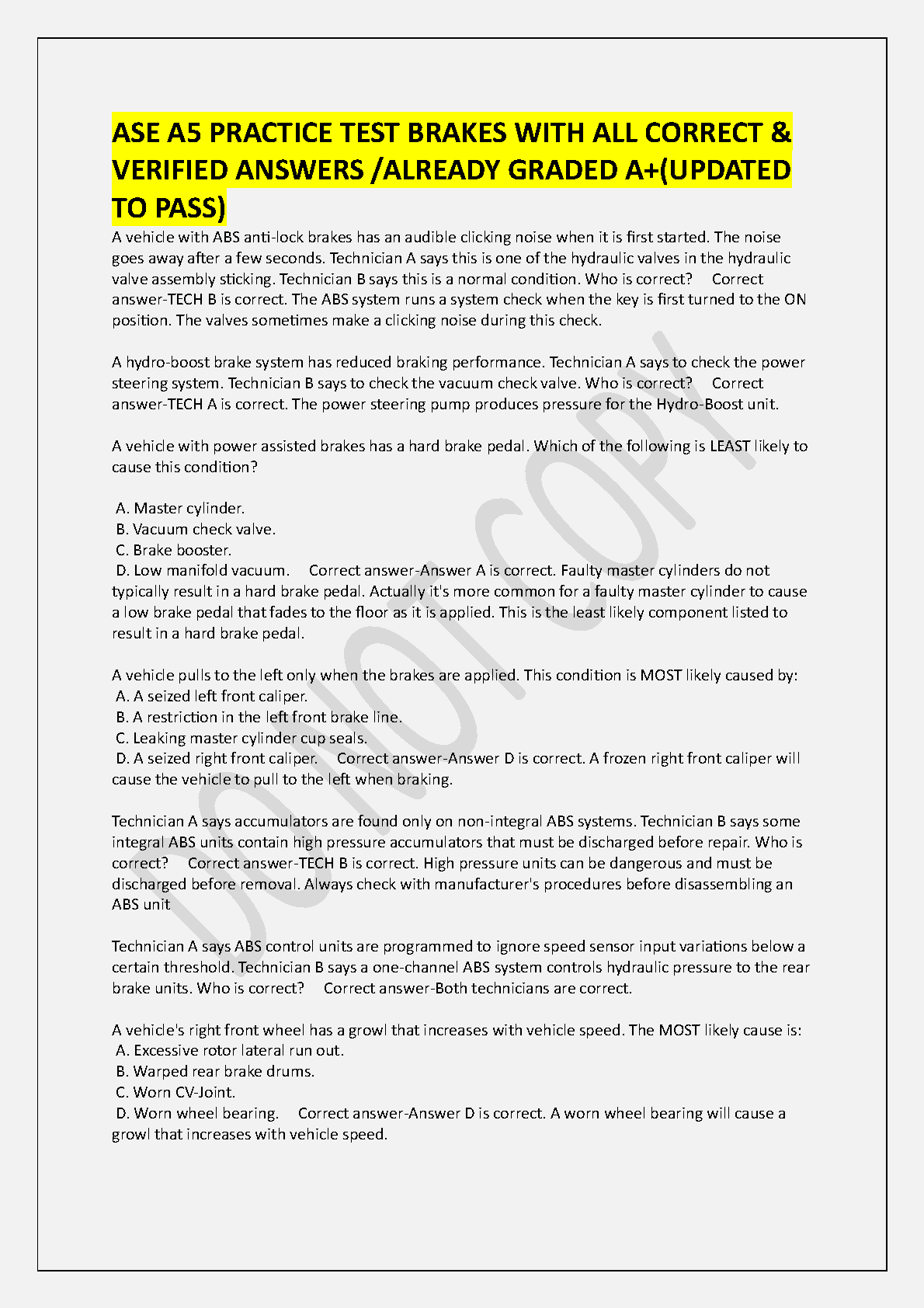 Ace your ASE A5 Brakes certification exam with this ultimate 2025/2026 test bank! This comprehensive resource is packed with a wide range of practice questions and detailed, verified answers, covering all critical topics such as Anti-Lock Braking Systems (ABS), hydro-boost units, brake hydraulics, and diagnostics. Each question is designed to mirror the actual exam format, helping you build confidence and master the material. Stop worrying about resits and guarantee your success. Download now to get the A+ grade you need to pass on your first attempt!
