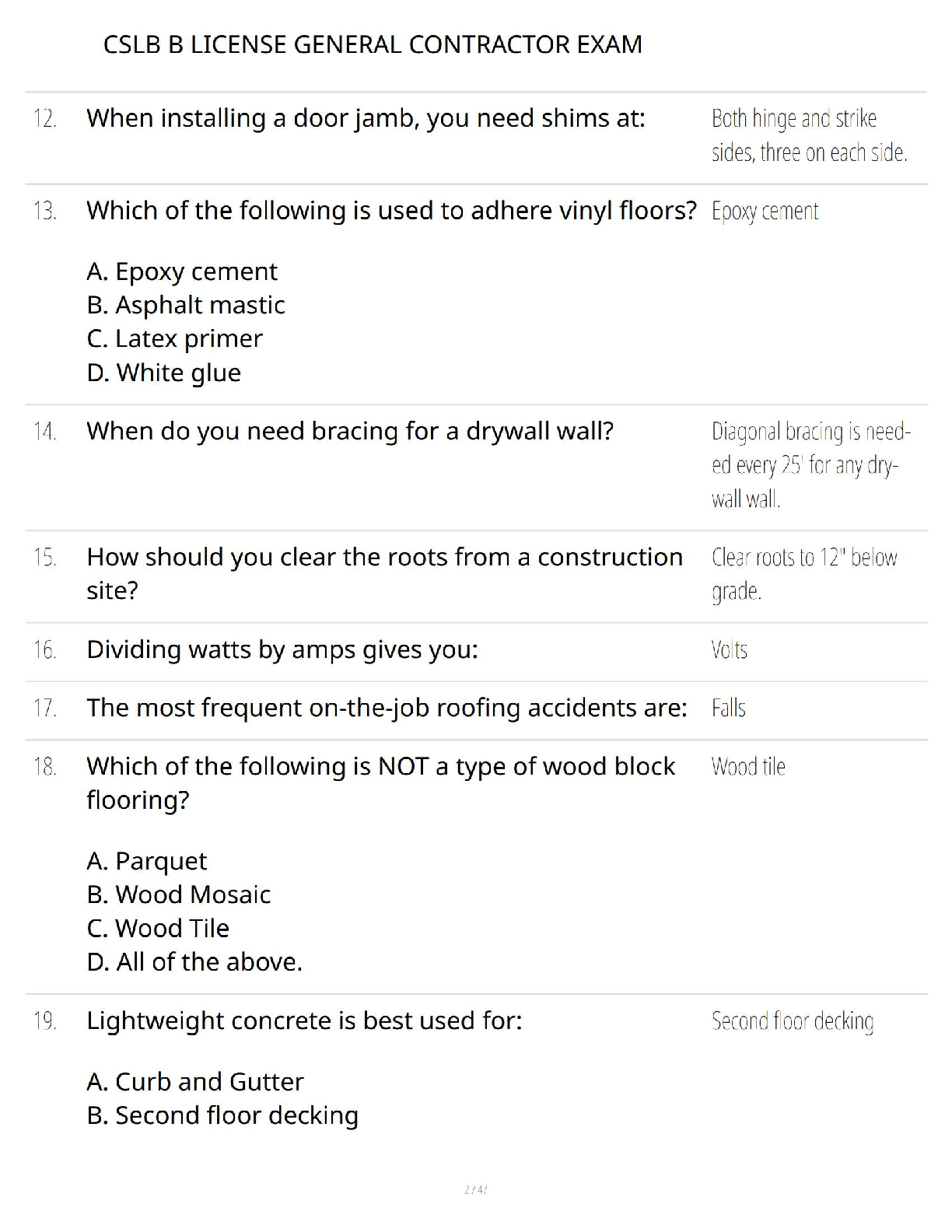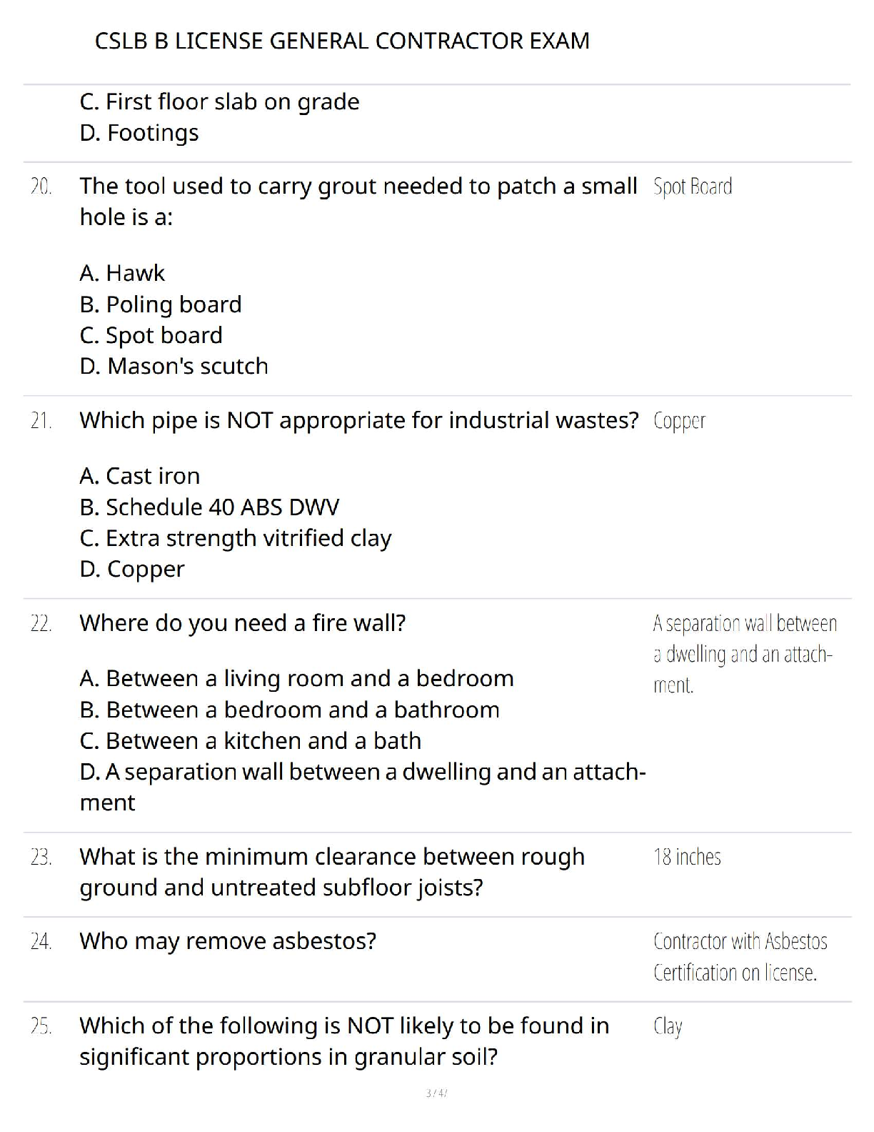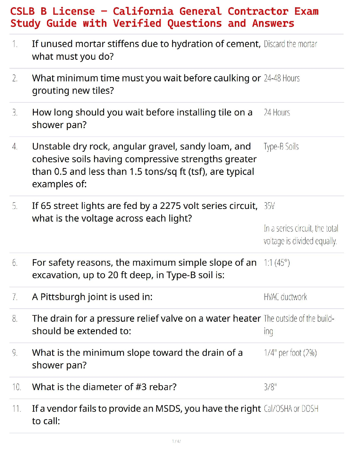 Ace your California General Contractor B License exam with this complete study guide. This resource features a comprehensive collection of verified questions and answers, meticulously designed to cover all critical topics you'll face on the CSLB test. Master key concepts in safety, building codes, materials, electrical systems, plumbing, and more. Our targeted Q&A format helps you study efficiently, identify knowledge gaps, and build the confidence needed to pass on your first attempt. Get fully prepared to earn your CSLB B License and launch your career as a general contractor in California.