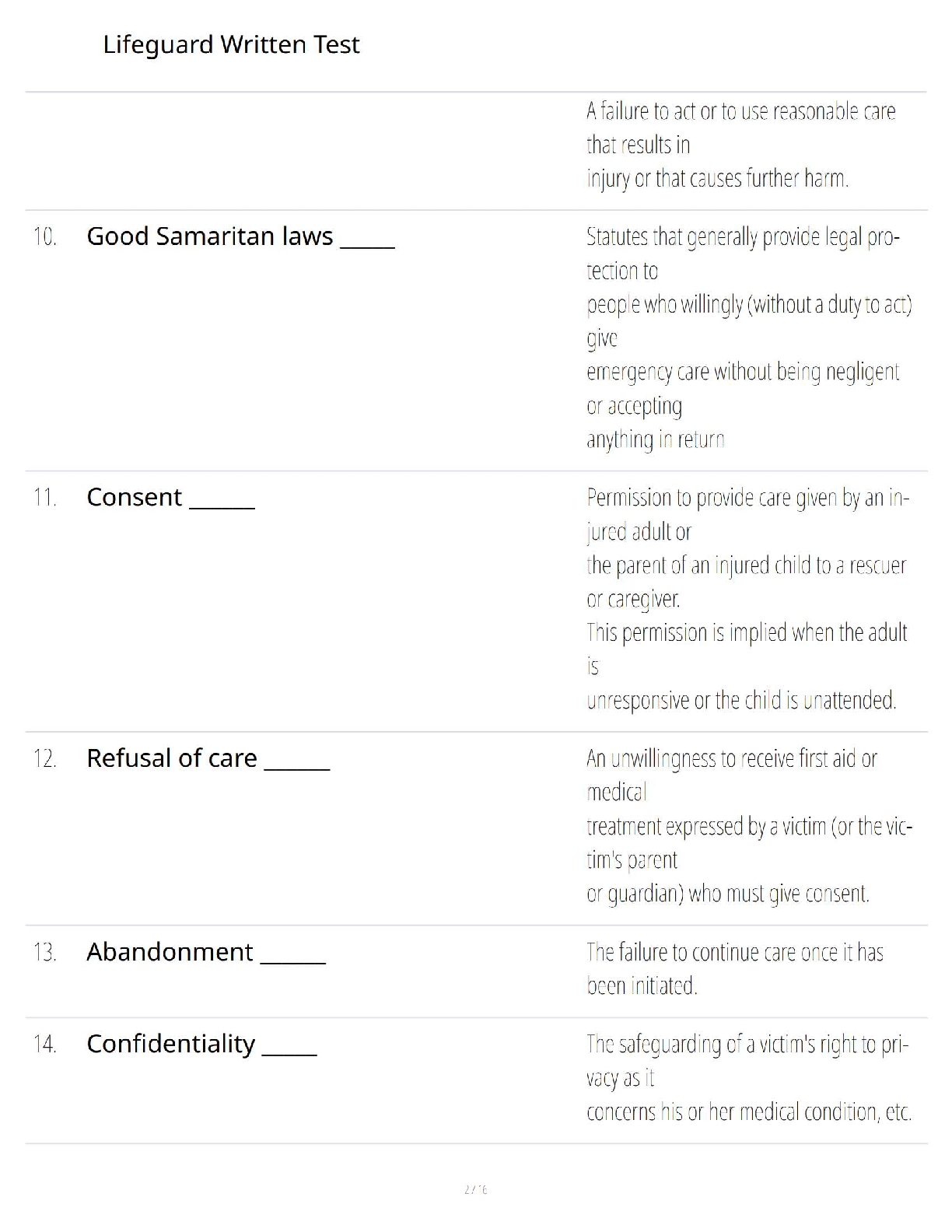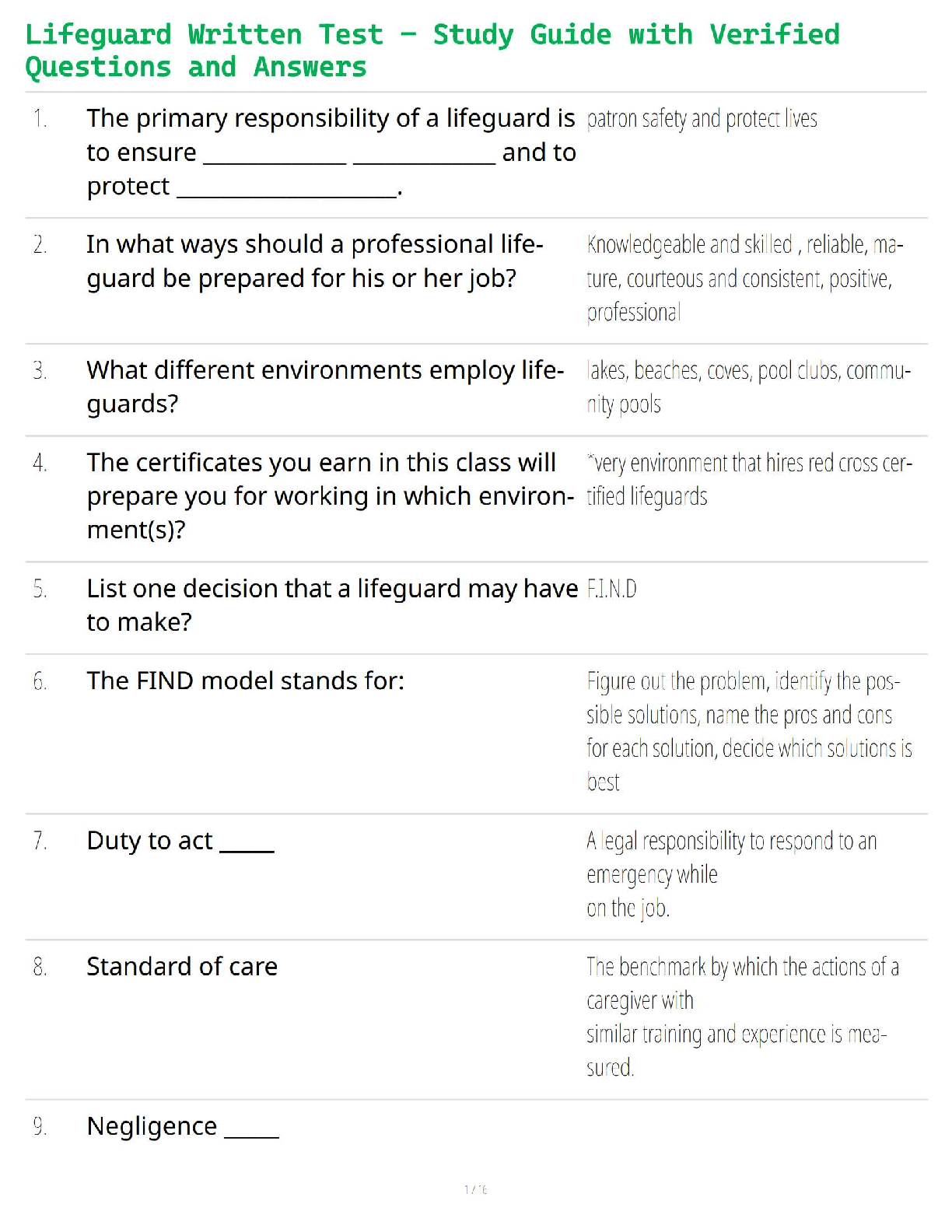 Prepare to ace your American Red Cross Lifeguarding certification exam with our comprehensive test bank, based on the latest edition of the Lifeguarding Manual. This essential study guide features a complete collection of verified questions and detailed answers, covering every critical topic you'll face on the written test. From understanding the primary responsibilities of a lifeguard and the FIND decision-making model to mastering legal concepts like duty to act, standard of care, and negligence, this resource ensures you are fully prepared. Boost your confidence and guarantee your success by studying with the most accurate and up-to-date materials available.