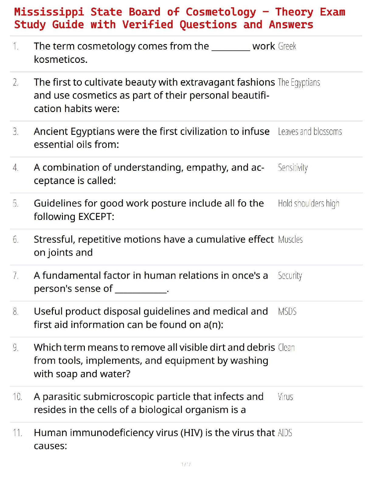 Mississippi State Board of Cosmetology Theory Exam Test Bank 2024-2025 | Complete Study Guide with Verified Questions and Answers