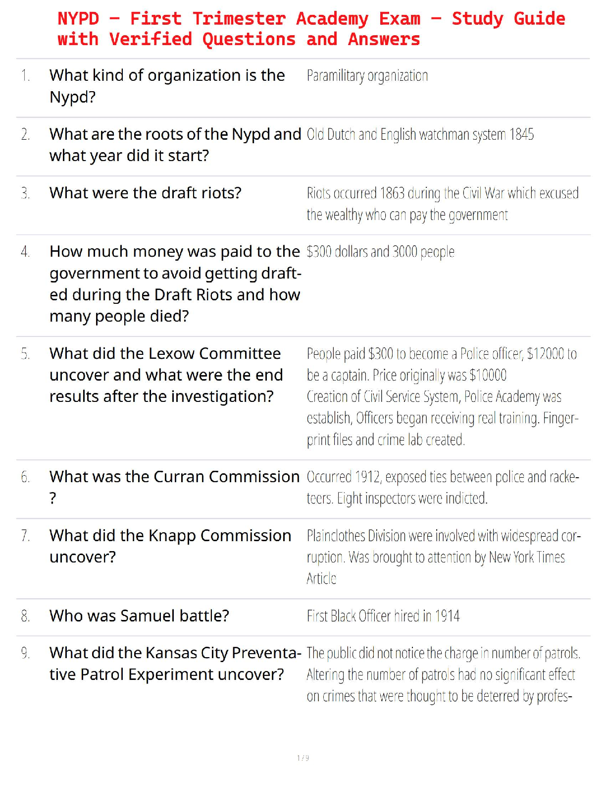 Prepare to excel in your law enforcement career with our comprehensive study guide for the NYPD First Trimester Academy Exam. This latest 2025/2026 edition is meticulously crafted to ensure you pass on your very first attempt, eliminating the stress of resits. Inside, you'll find a complete set of verified questions and their detailed answers, covering all critical topics from the academy's curriculum. Dive deep into the history of the NYPD, understand the significance of events like the Draft Riots, and learn about pivotal investigations such as the Lexow, Curran, and Knapp Commissions. This essential resource is your key to mastering the material and confidently passing your first trimester exam.