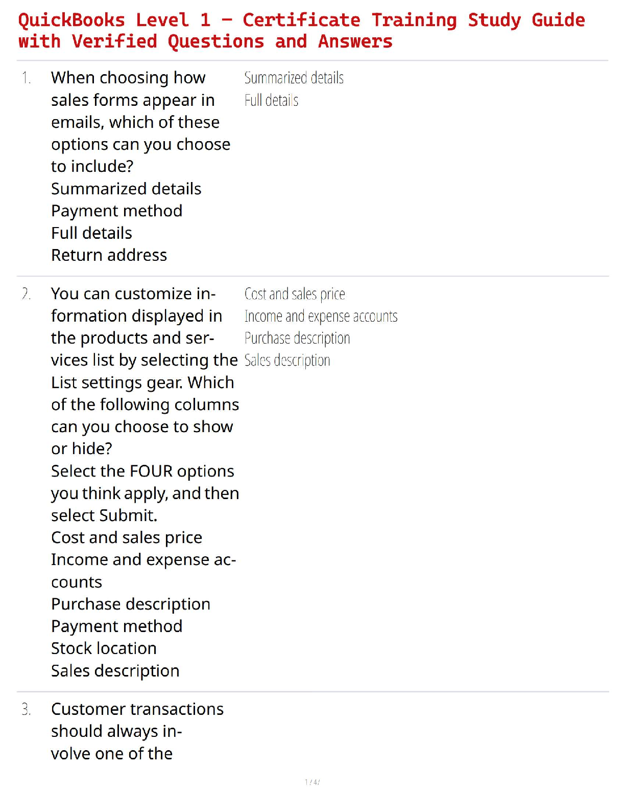 Ace your QuickBooks Level 1 Certification exam with our meticulously prepared 2025/2026 Test Bank. This comprehensive study guide features an extensive collection of verified questions and detailed answers, covering all essential topics you'll face on the actual test. Designed to help you study smarter, not harder, this resource is your key to mastering QuickBooks fundamentals and passing your certification on the first attempt. Say goodbye to exam anxiety and avoid resits with this ultimate preparation tool.