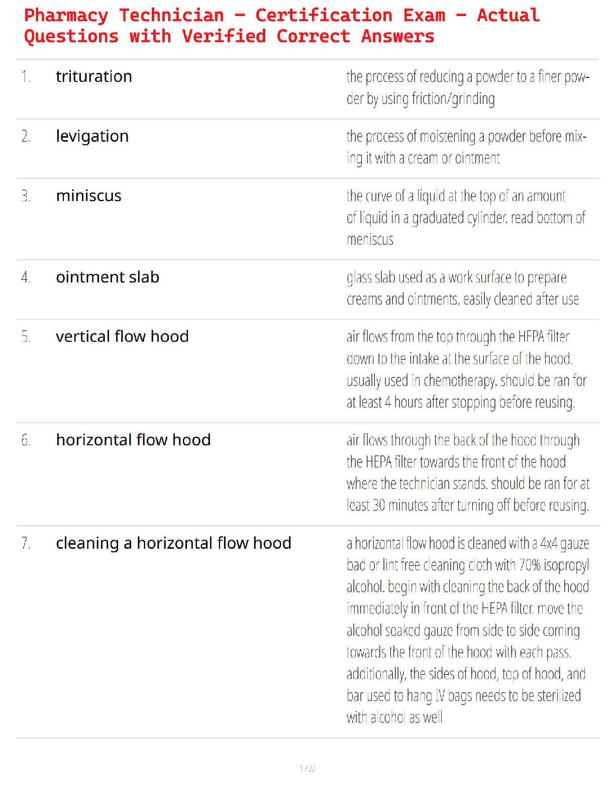 Get ready to excel in your Pharmacy Technician Certification Exam (PTCE) with our latest 2025/2026 test bank. This comprehensive study resource is packed with actual exam questions and meticulously verified answers, covering all essential topics for the certification. From fundamental concepts like trituration and levigation to critical procedures involving vertical and horizontal flow hoods, this guide ensures you have the knowledge to pass confidently. Designed to help you master the material efficiently and avoid resits, this is your ultimate tool for achieving certification on your very first try.