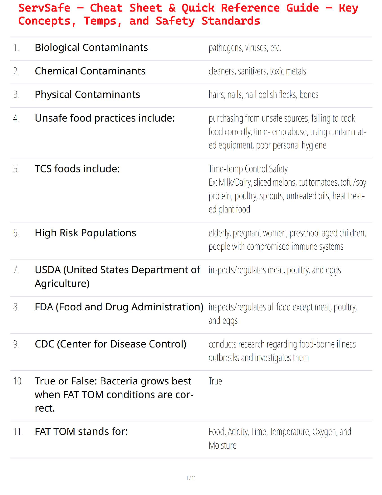Ace your ServSafe Food Manager certification on the first try with this essential study guide! Based on the latest 8th Edition materials from the National Restaurant Association, this comprehensive cheat sheet breaks down the most critical information you need to know. Master key concepts such as biological, chemical, and physical contaminants, Time-Temperature Control for Safety (TCS) foods, and the vital FAT TOM principles for bacterial growth. This concise guide is expertly designed to streamline your revision, helping you grasp essential food safety standards efficiently. Say goodbye to exam anxiety and avoid costly resits. Download now to secure your certification with confidence!