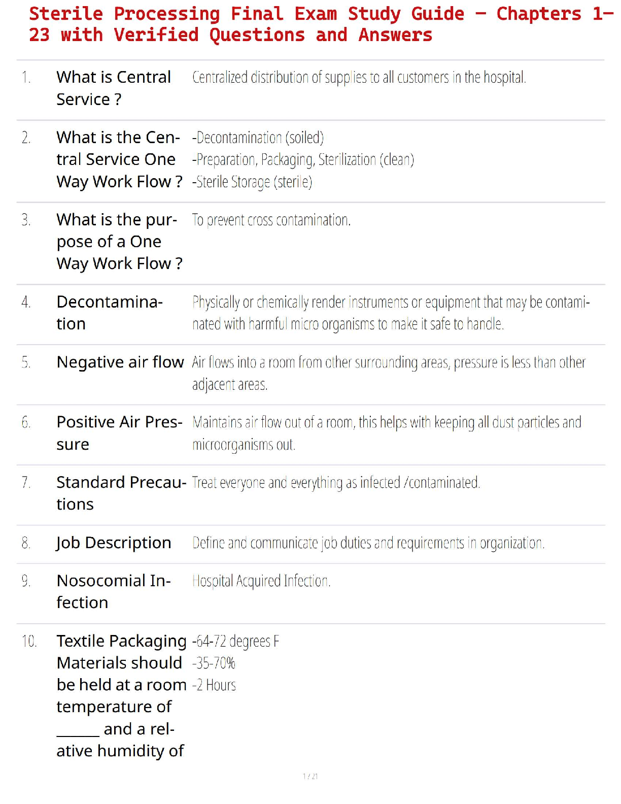 Master your Sterile Processing final exam with this complete test bank for the Central Service Technical Manual, 9th Edition by IAHCSMM. This indispensable study guide features a comprehensive collection of verified questions and detailed answers covering all 23 chapters. Deepen your understanding of critical topics such as decontamination, sterilization processes, infection control, and central service workflow. This resource is expertly designed to help you prepare effectively, build confidence, and pass your certification exam on the very first try. Secure your success as a Central Service Technician with this essential exam preparation tool.