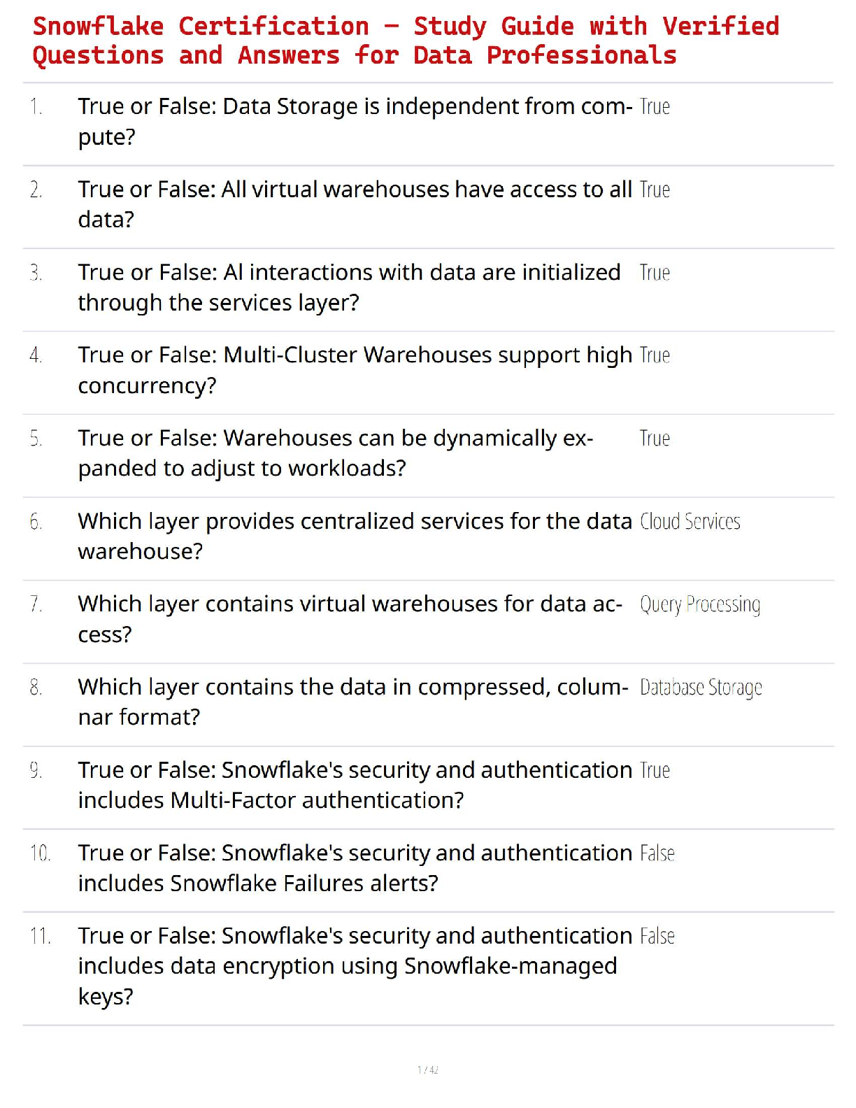 Prepare to ace your Snowflake SnowPro Core Certification exam with our comprehensive test bank, specifically designed for data professionals. This study guide features a complete collection of exam-style questions, each with a verified and accurate answer. Dive deep into crucial Snowflake concepts, including the separation of storage and compute, virtual warehouses, data layers, multi-cluster concurrency, and security protocols. Our resource is your key to understanding the material thoroughly and passing your certification on the first attempt.