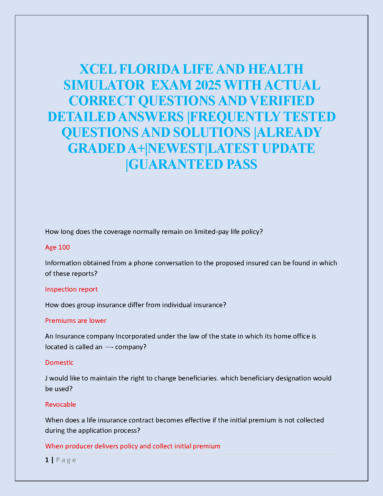 Ace your Florida Life and Health insurance licensing exam with confidence! This is the complete, A+ graded test bank for the XCEL Florida Life and Health Simulator Exam, fully updated for the 2025 testing cycle. Inside, you'll find a comprehensive collection of frequently tested questions paired with detailed, verified answers and solutions. Our resource covers all the essential topics you need to master, ensuring you're fully prepared for the actual exam. Designed to guarantee a pass on your first attempt, this study guide helps you avoid costly resits and fast-track your insurance career.