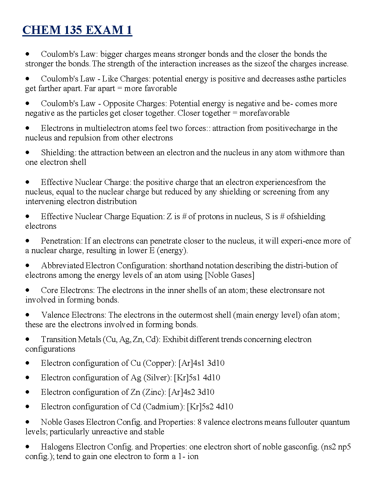Ace your CHEM 135 Exam 1 with this comprehensive and up-to-date study guide for the 2025/2026 academic year. This detailed exam elaboration provides a clear and concise breakdown of all essential topics, ensuring you grasp the core concepts needed to pass on your first try. Dive deep into Coulomb's Law to understand bond strength and potential energy. Master the principles of effective nuclear charge, shielding, and electron penetration. This guide simplifies complex topics like abbreviated electron configurations, distinguishing between core and valence electrons, and covers the specific configurations and properties of transition metals, noble gases, and halogens. Stop worrying about resits and secure your A with this targeted study resource!