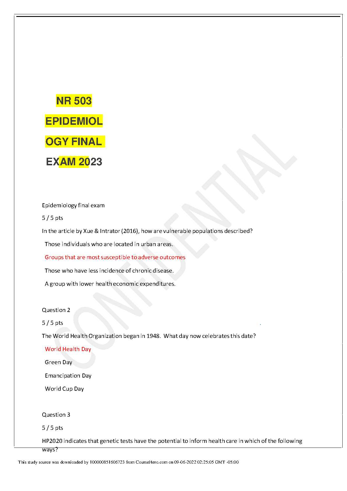 Ace your NR 503 Epidemiology final exam with this comprehensive test bank for 2023. This verified resource contains a complete collection of exam questions along with their correct, detailed answers. Ideal for practice and review, this study guide is designed to help you master key epidemiological concepts, understand the question patterns, and build confidence to pass your exam successfully. Download now to prepare effectively and achieve the best possible grade in your NR 503 course.