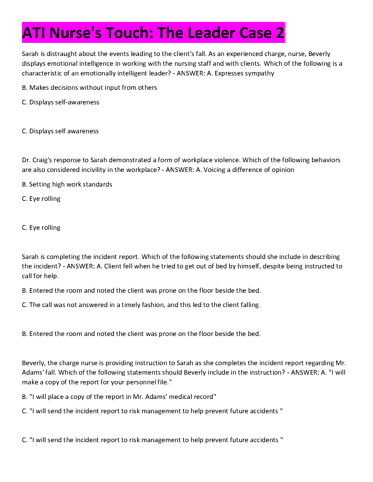 ATI Nurse's Touch: The Leader Case 2 Test Bank | Complete Exam Questions and Verified Answers