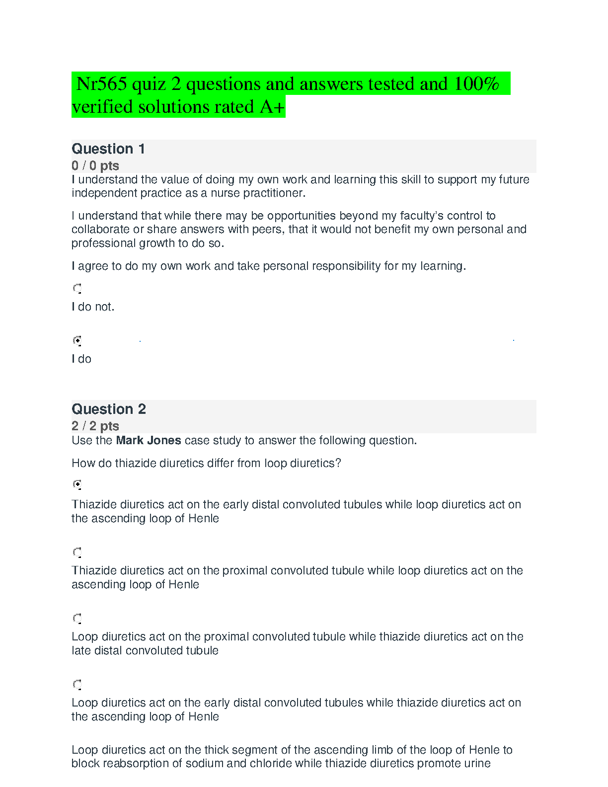 Ace your NR565 Advanced Pharmacology Fundamentals exam with this comprehensive test bank for Quiz 2. This A+ graded resource provides meticulously verified questions and their correct answers, covering key topics like diuretics as seen in the Mark Jones case study. Aligned with Lehne's Pharmacology for Nursing Care, 11th Edition by Burchum and Rosenthal, this study guide is expertly designed to help you grasp complex pharmacological concepts. Master the material, boost your confidence, and secure a top grade on your Quiz 2. Download now to start studying smarter and pass your exam with flying colors.