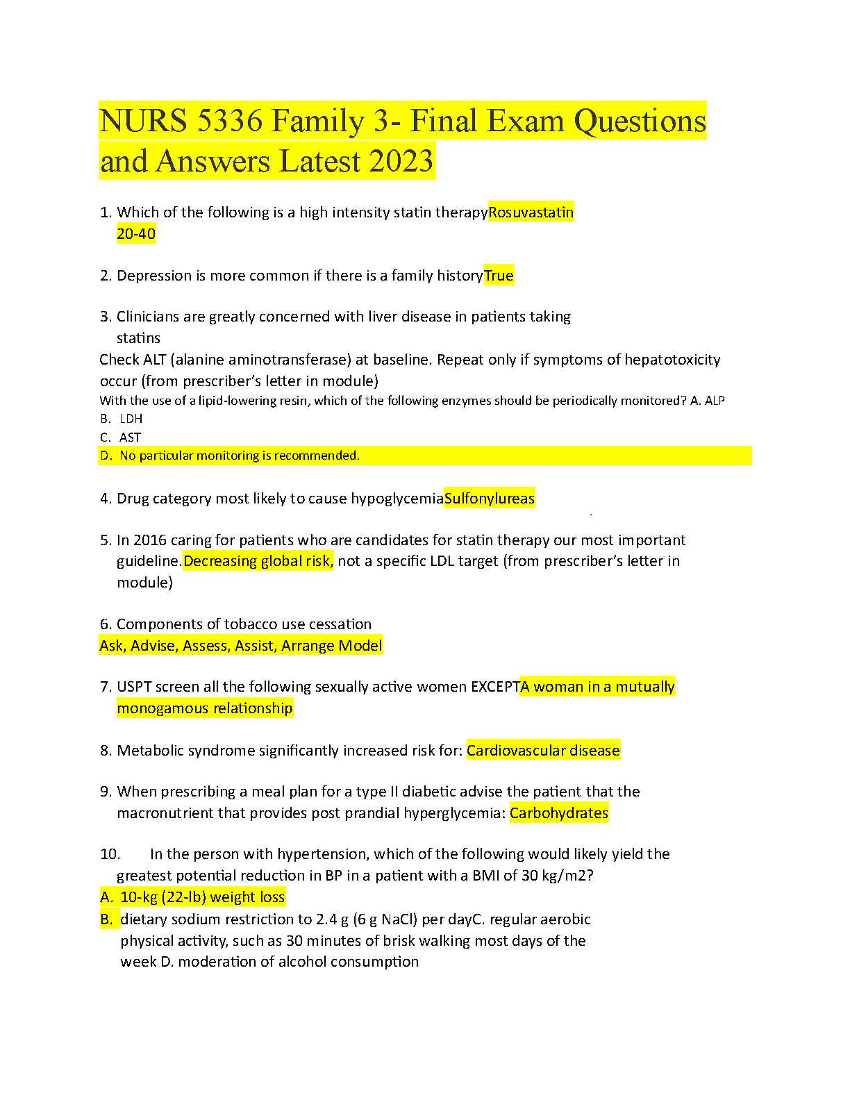 Prepare effectively for your NURS 5336 Family 3 Final Exam with this comprehensive test bank. This resource contains the latest 2024 updated questions and expertly verified answers, covering crucial topics seen on the exam, including pharmacology (statins, sulfonylureas), risk assessment, patient counseling for lifestyle changes, and management of chronic conditions like metabolic syndrome and hypertension. This study guide is designed to help you master the material and excel in your final assessment.