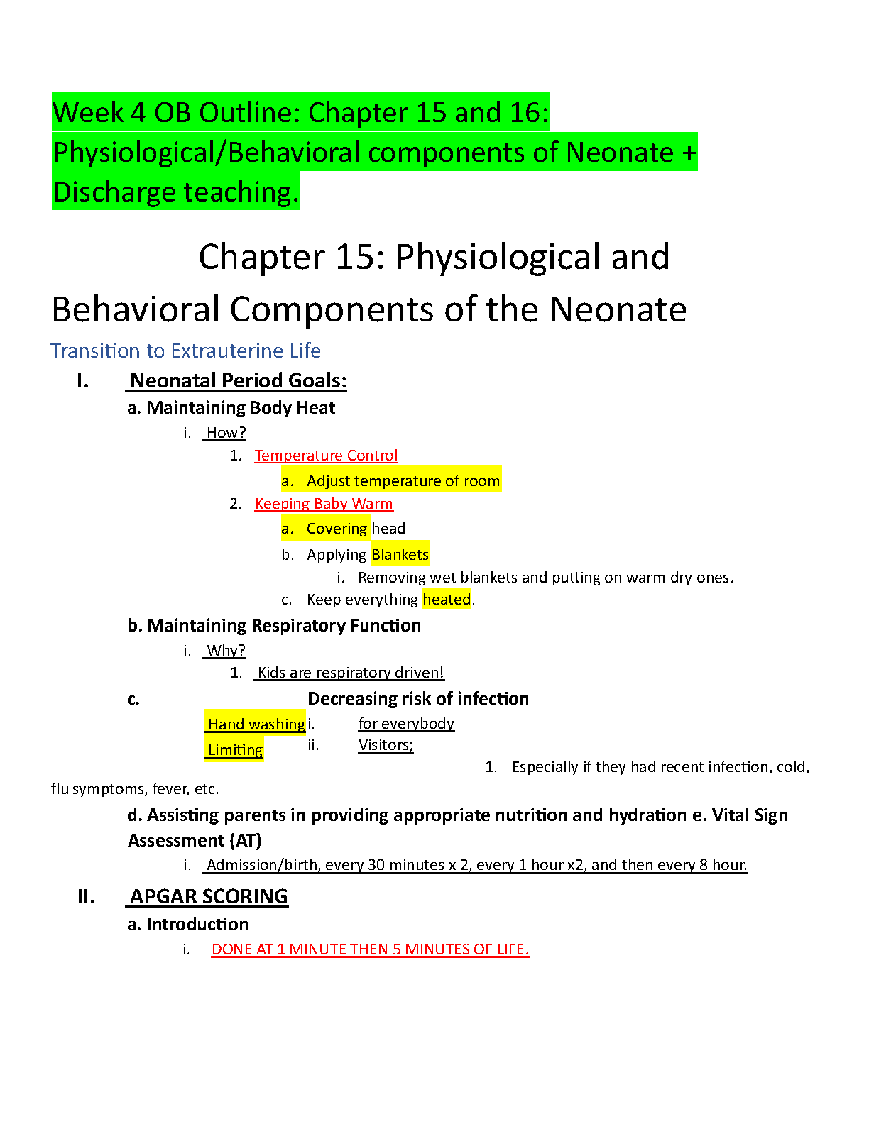 OB Nursing Exam Elaboration: Comprehensive Notes for Chapters 15 & 16 on Neonatal Physiology & Discharge Teaching | 2025/2026 First-Attempt Pass Guide