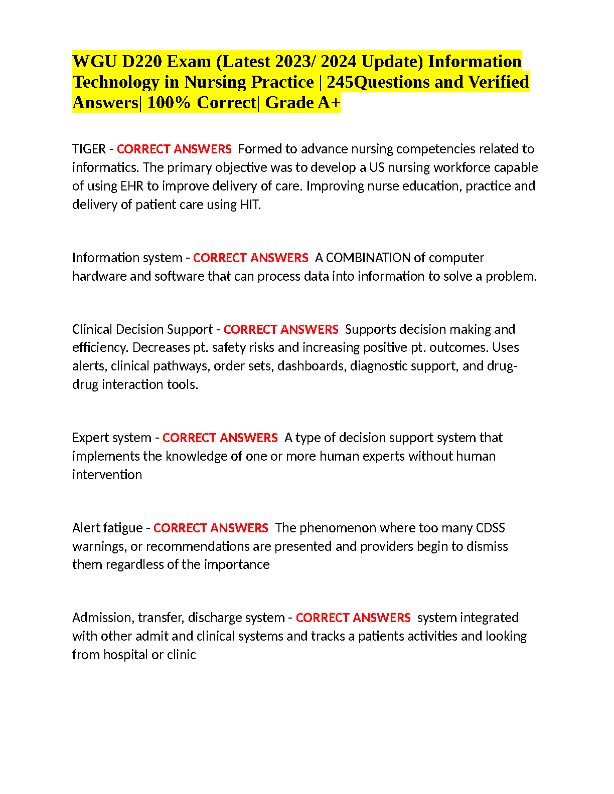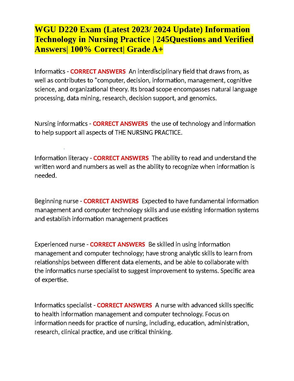 Excel in your WGU D220 course with our comprehensive test bank for Information Technology in Nursing Practice. This 2024 updated guide features 245 meticulously verified questions and 100% correct answers to ensure you master key concepts. Covering essential topics like informatics, nursing informatics, and information literacy, this resource is expertly designed to help you achieve a Grade A+ and pass your exam with confidence on the first attempt.