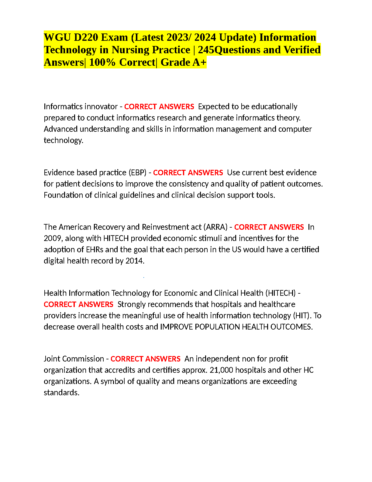 WGU D220 Information Technology in Nursing Practice Test Bank (2025/2026 Edition) | 245 Questions & Verified Answers