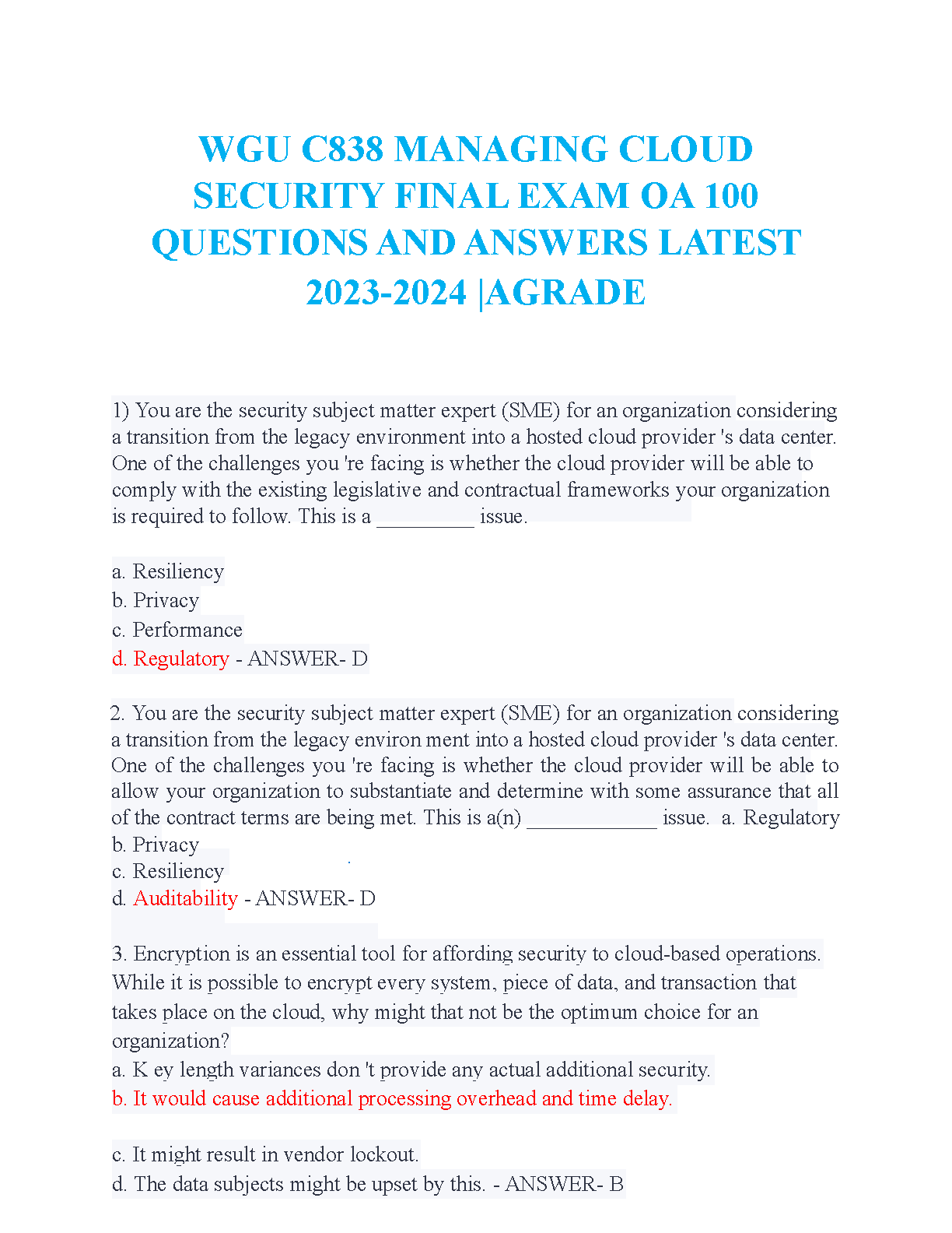 Ace your WGU C838 Managing Cloud Security final exam with our ultimate study resource! This comprehensive test bank is specifically designed for the Final Objective Assessment (OA) and is fully updated for the 2025-2026 academic year. Inside, you'll find 100 meticulously compiled questions and their verified answers, covering all key topics of the course. This A-grade material is your key to understanding complex concepts and mastering the exam content. Stop worrying about resits and pass with confidence on your first attempt. Download now and secure your success in Managing Cloud Security!