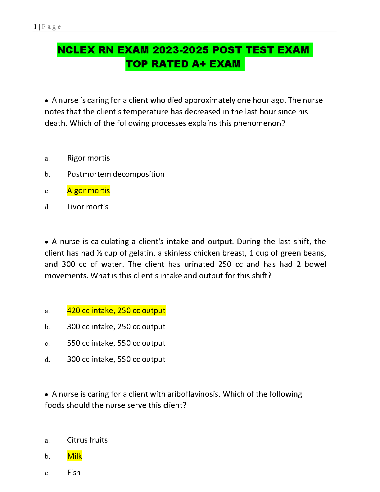 Ace your nursing licensure exam with our comprehensive NCLEX-RN Post-Test Exam Bank for 2023-2025. This top-rated, A+ graded study resource is expertly designed to help you master key nursing concepts and pass the NCLEX on your very first try. Inside, you'll find a wide range of practice questions covering essential topics, complete with verified answers. This guide is your ultimate tool for effective preparation, boosting your confidence, and avoiding costly resits. Get ready to achieve your nursing career goals with this essential study aid.