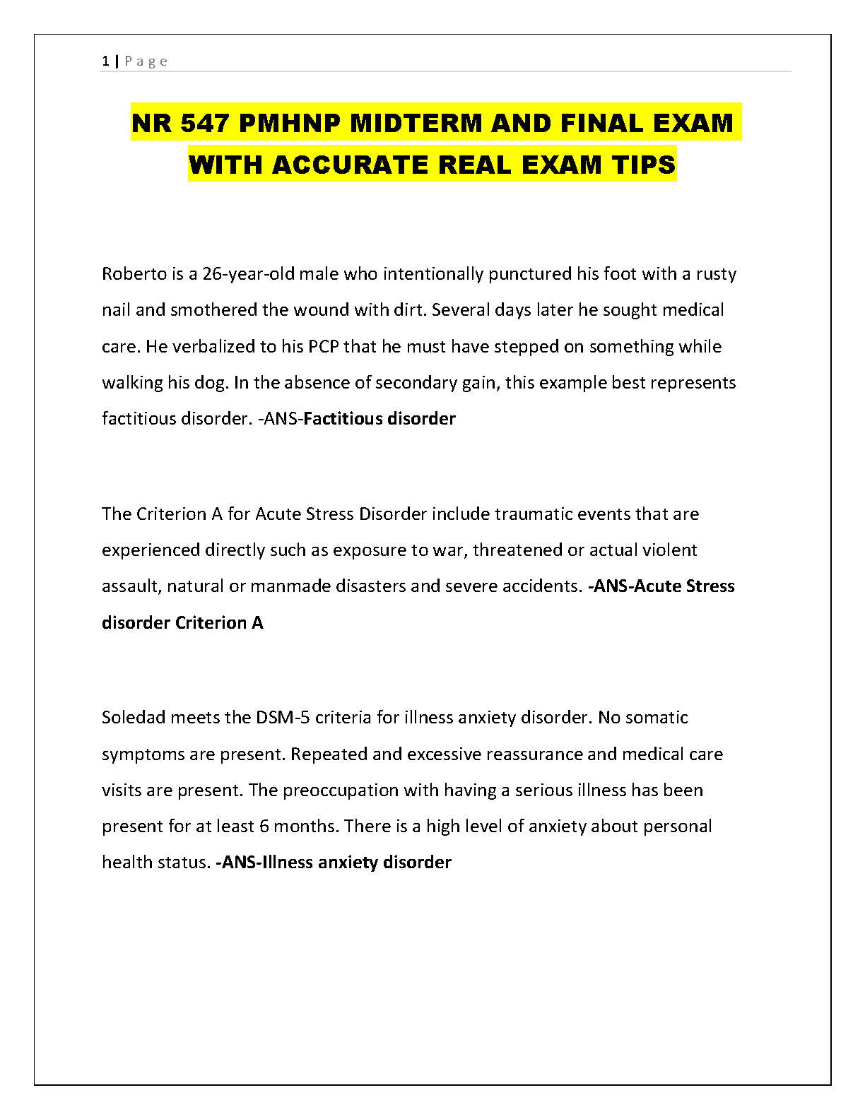 Unlock success in your NR 547 PMHNP course with our comprehensive test bank, specifically designed for the Midterm and Final exams. This 2025/2026 updated resource provides a wide array of accurate, real exam-style questions with verified answers. Delve into key topics in lifespan psychopharmacology, including detailed scenarios covering DSM-5 criteria for disorders like factitious disorder and anxiety disorders. This essential study tool is crafted to help you understand complex concepts, prepare effectively, and pass your exams with confidence on your first try. Stop stressing and start studying smarter with our NR 547 exam prep guide.