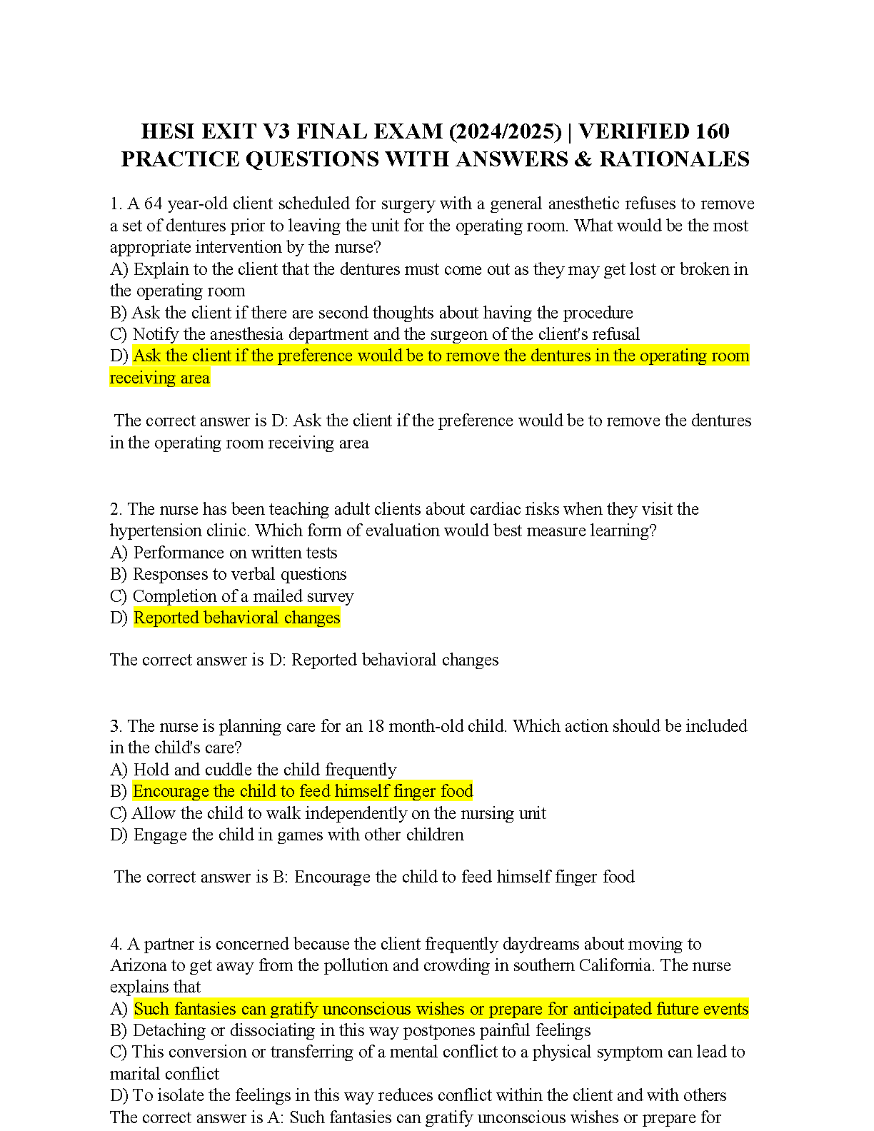 HESI Exit V3 Final Exam Test Bank 2024/2025: 160 Verified Questions & Rationales by Elsevier