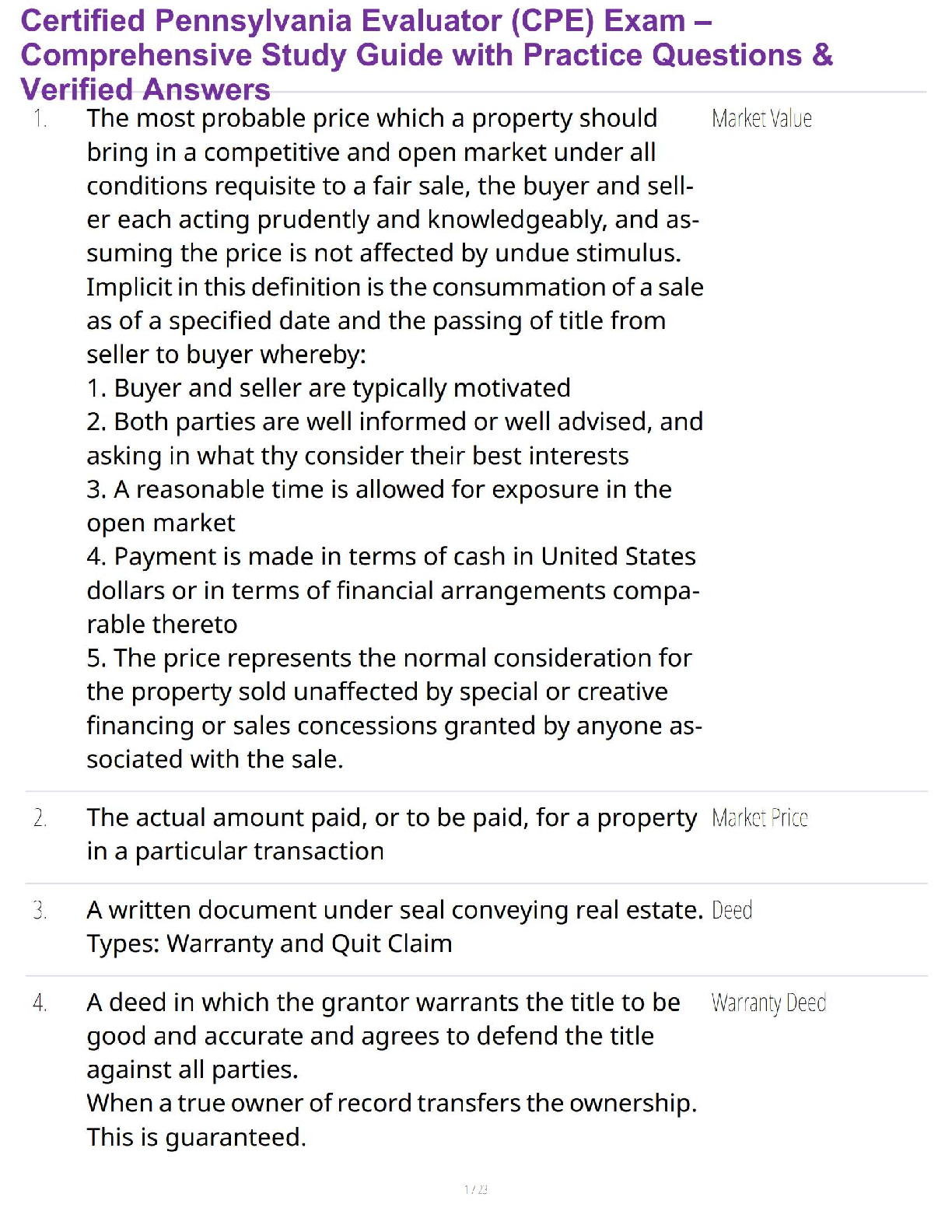 Unlock success on your Certified Pennsylvania Evaluator (CPE) Exam with our latest 2025/2026 comprehensive study guide. This all-in-one resource is meticulously crafted to ensure you pass on your first attempt, featuring a vast collection of practice questions that mirror the actual exam format. Each question comes with a detailed, verified answer, helping you master key concepts in property evaluation, market value, real estate law, and more. Stop worrying about resits and start your journey to certification with confidence. This guide is your essential tool for acing the CPE exam.