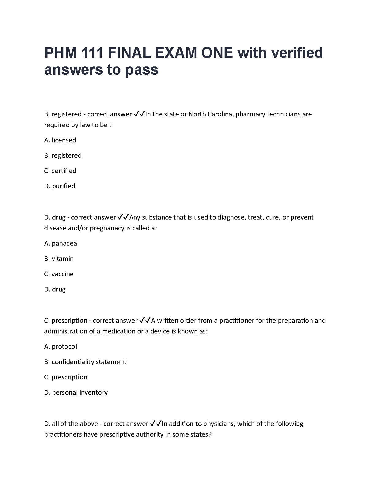 PHM 111 Final Exam 1 Test Bank | Comprehensive Study Guide with Verified Questions & Answers