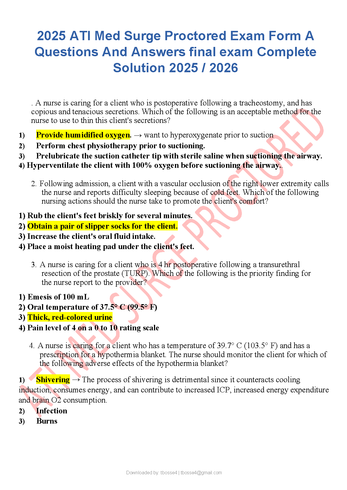 Unlock exam success with the complete 2025/2026 ATI Med Surg Proctored Exam Form A guide. This resource provides an exhaustive collection of questions paired with thoroughly verified answers and rationales. Designed to help you master critical medical-surgical nursing concepts, this solution set is your ultimate tool for studying effectively, building confidence, and passing your proctored exam on the very first try. Avoid resits and achieve your academic goals with this up-to-date and essential study aid.