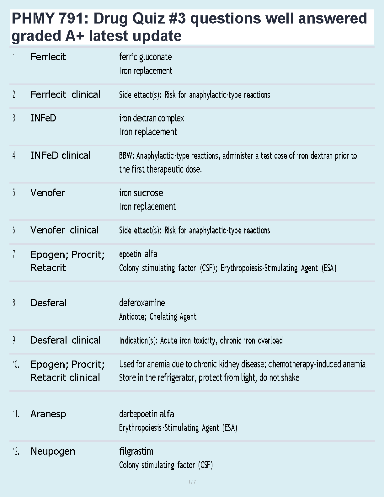 Master your pharmacology course with this A+ graded study guide for PHMY 791 Drug Quiz #3. Updated for the 2025/2026 academic year, this resource provides expertly answered questions covering essential drugs for anemia and iron-related conditions, including Ferrlecit, INFeD, Epogen, and Desferal. Each answer details drug classifications, clinical uses, and critical safety information. This guide is your key to understanding complex concepts, acing your quiz on the first attempt, and avoiding resits.