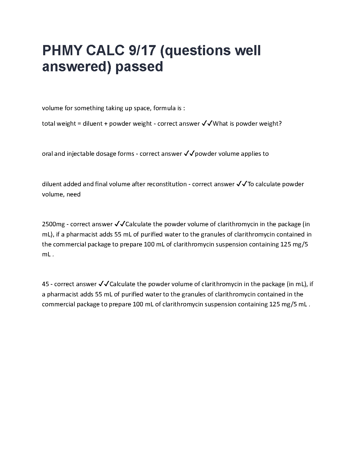 Master your pharmacy calculations with our comprehensive PHMY CALC 9/17 study guide, fully updated for the 2025/2026 academic year. This resource provides a detailed bank of exam-style questions with verified, correct answers to ensure you pass on your first try. Key topics covered include powder volume, total weight formulas, reconstitution, and calculations for oral and injectable dosage forms. Avoid resits and build confidence by preparing with these expertly answered questions, designed to help you ace your exam.