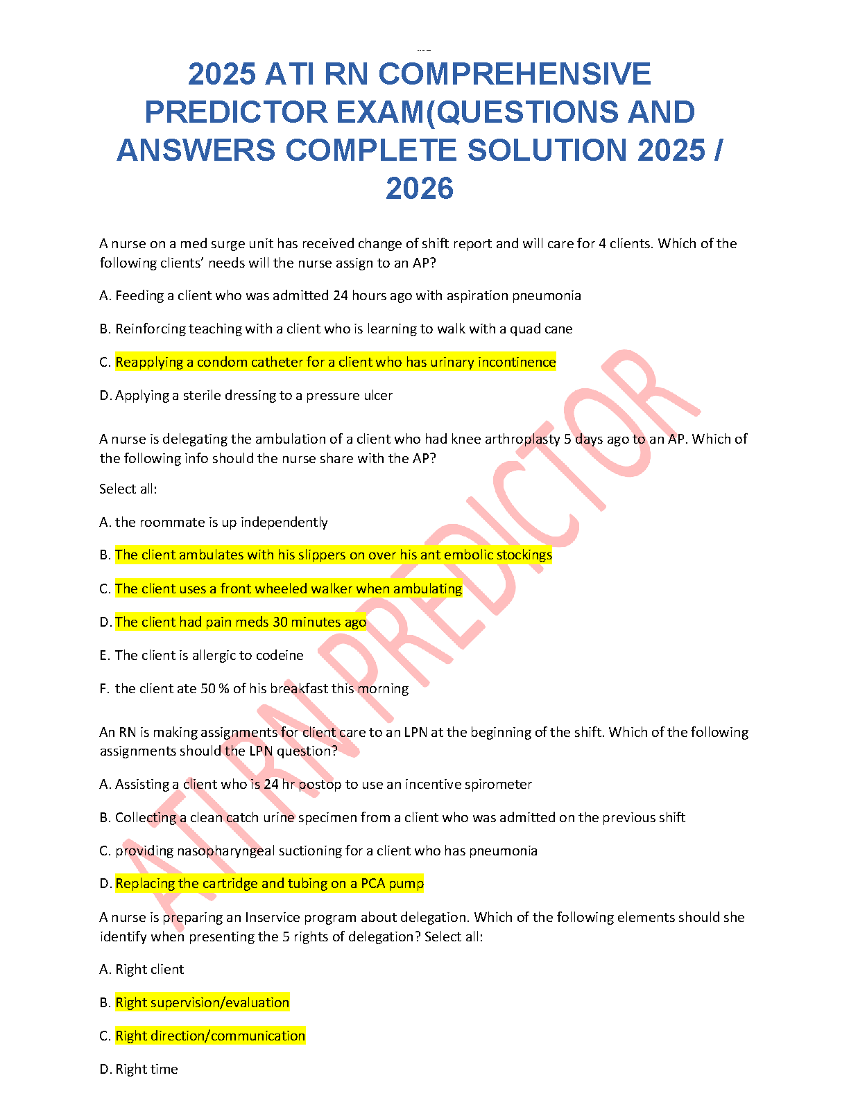 Unlock your potential and ace the ATI RN Comprehensive Predictor Exam on your first try with this essential 2025/2026 study guide. This complete test bank features a vast collection of exam-style questions paired with 100% correct and verified answers. Designed to build your confidence and mastery of key nursing concepts, this resource is your ultimate tool for avoiding resits and achieving top scores. Prepare effectively, understand complex scenarios, and step into your exam fully prepared for success.