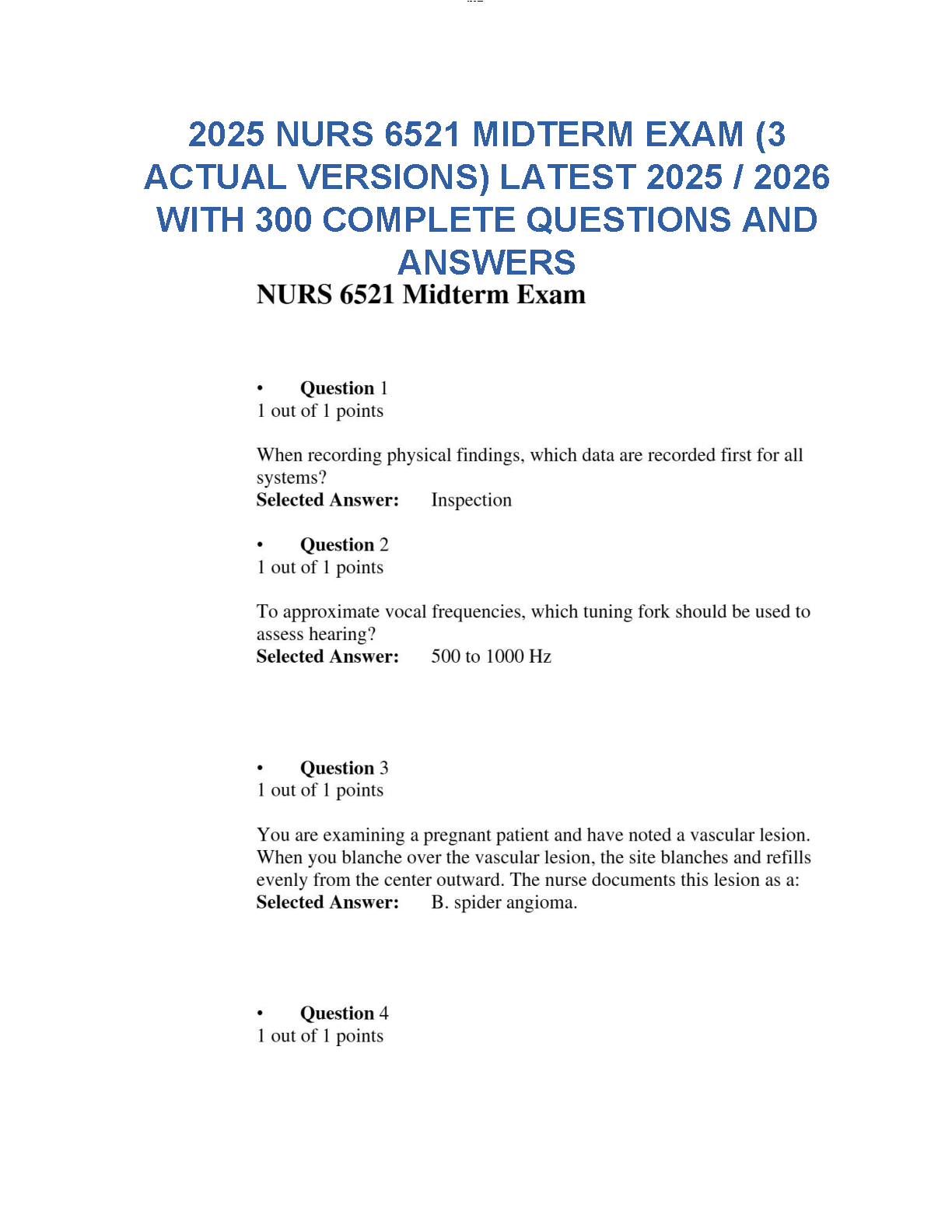 Get ready to ace your NURS 6521 Midterm Exam with our comprehensive test bank, fully updated for the 2025-2026 academic year. This essential study resource includes three distinct versions of the actual midterm exam, featuring over 300 meticulously compiled questions and their complete, verified answers. Designed to cover all key topics in Advanced Health Assessment, this guide is your key to understanding the exam format, mastering the material, and passing with confidence on your first try. Avoid resits and achieve the top grades you deserve with this invaluable preparation tool.